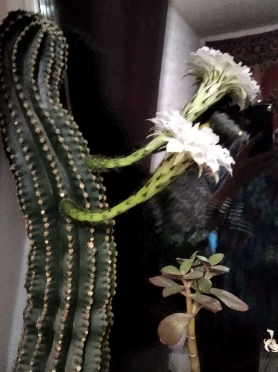 Притащил этот кактус, маленьким отростком лет 20 с гаком назад из школы. За это время цветы на нём были 3 раза, прошлые разы было по одному цветку и их никто не фоткал. В этот раз попросил маму сфоткать их, чтобы я хоть смог его цветы увидеть. В целом красиво.