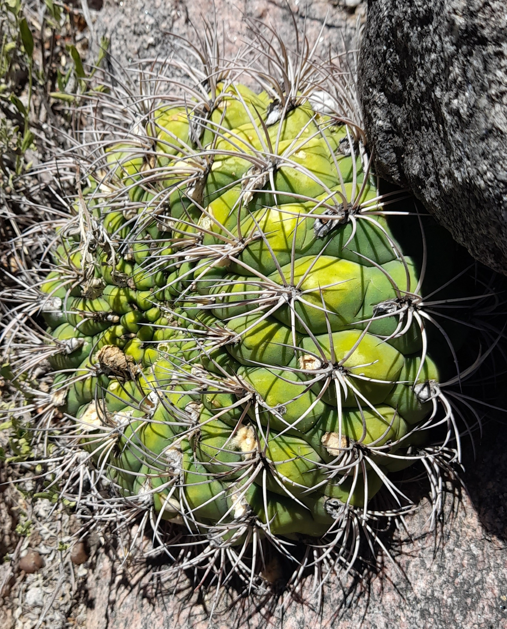 Tephrocactus aoracanthus. Один из самых опасных видов с острыми большими шипами. Колючки жесткие т торчат во все стороны, а сегменты легко отделяются от основного стебля. Вот такой один из способов размножения, зацепится длинной колючкой и отвалиться.