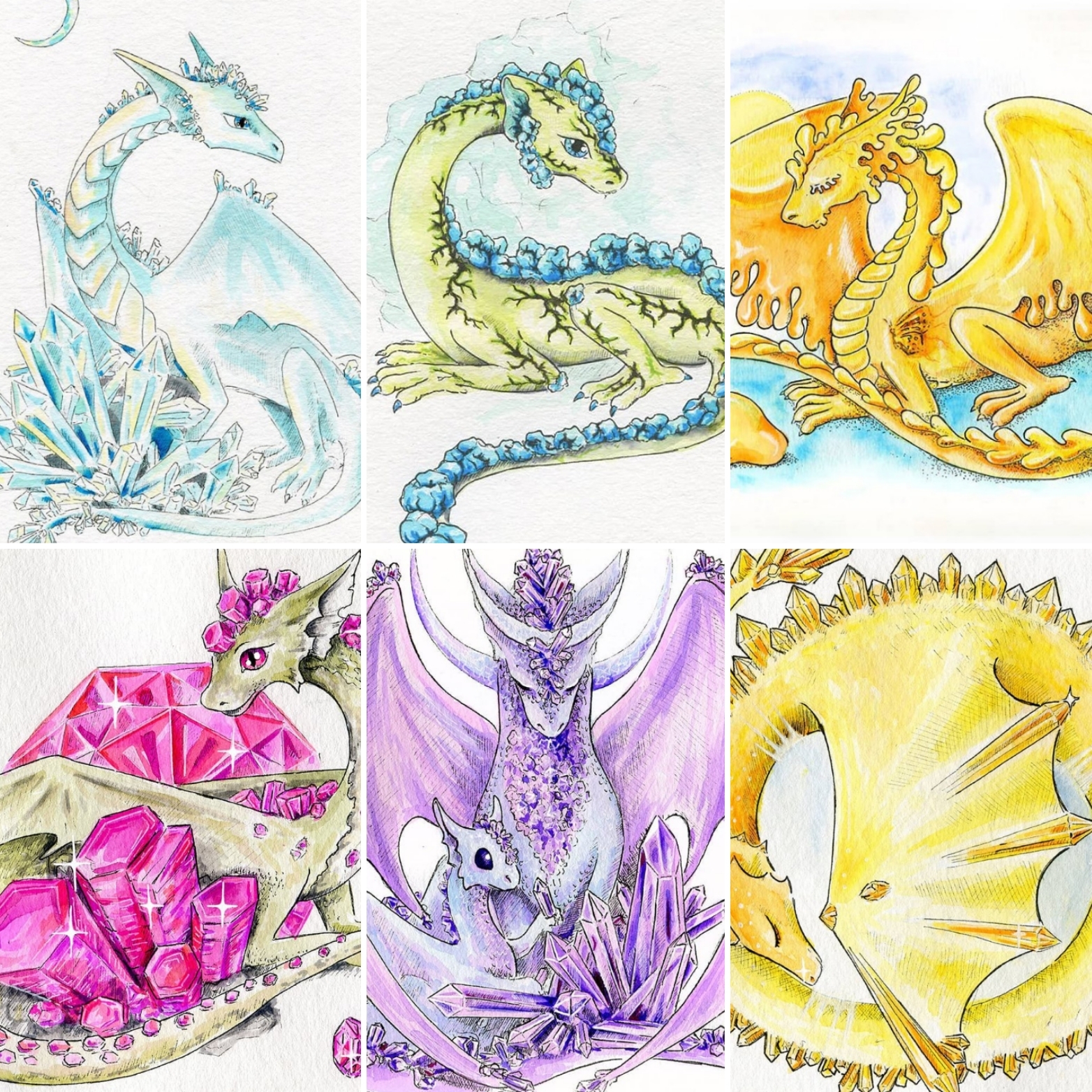 В позапрошлом году я рисовала дракончиков, связанных с ботаникой, и меня попросили сначала сделать с ними открытки, а потом и календарь. В этом году захотелось нового и были созданы дракошки-драгоценные камни. И календарь с ними почти готов :) Вот, делюсь превьюшечками к нему :)