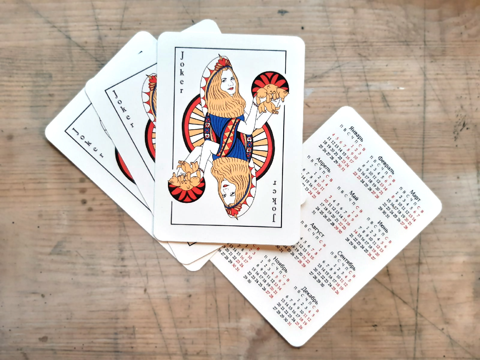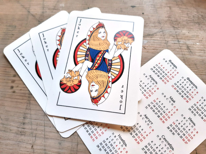 В посте Моя авторская колода карт я рассказывала что сделала свою колоду карт, после чего, каждую партию моя мама жаловалась что карту с ее изображением я сделала двойкой, это меня натолкнуло на идею подарка для нее. В молодости она собирала коллекцию карманных календариков, поэтому было решено нарисовать и напечатать джокера по ее фотографии: