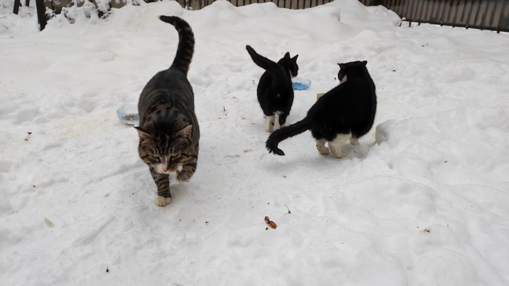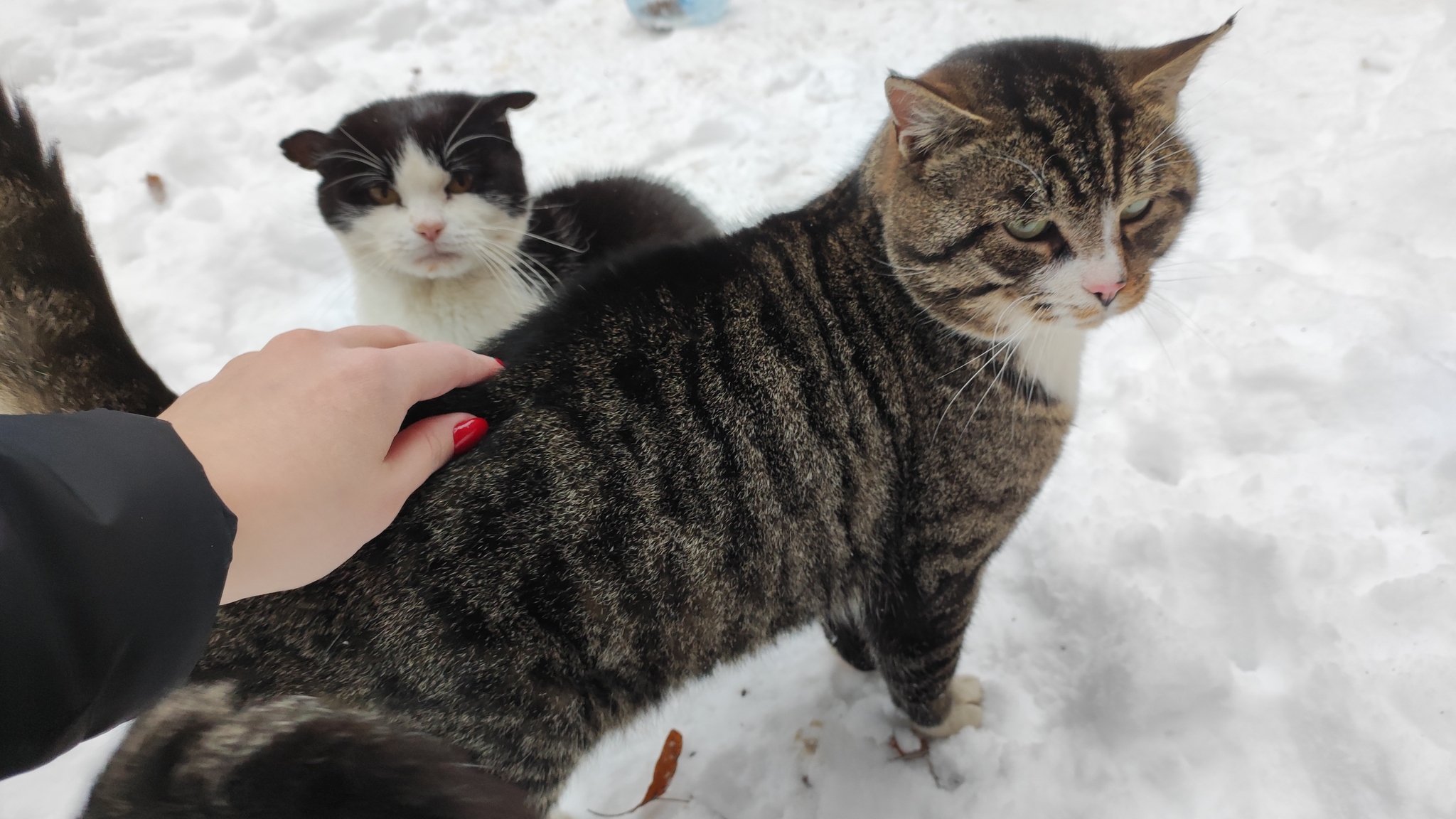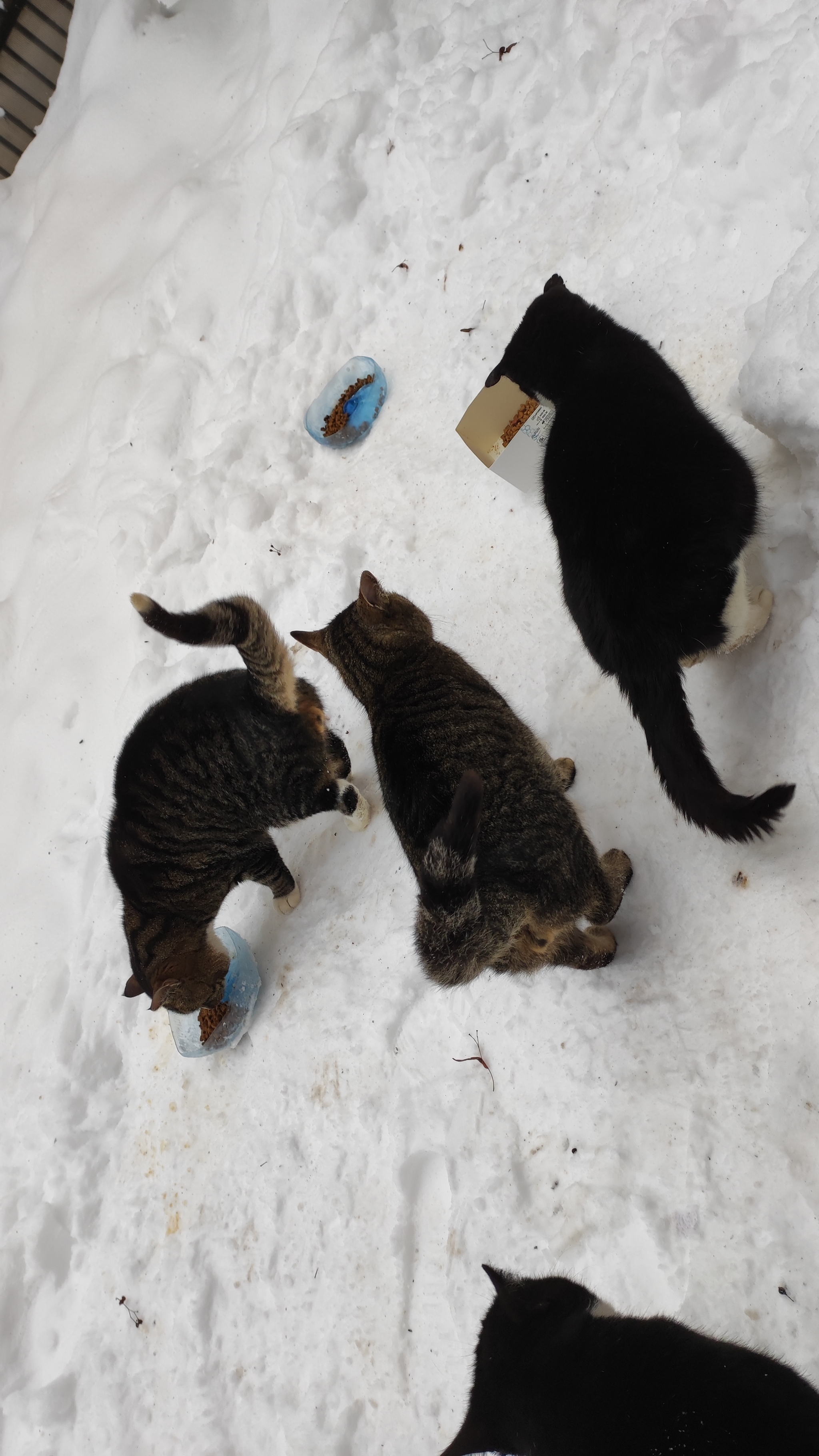 У нас за поликлиникой в центре города есть ласковые коты. Их шесть штук. Время от времени подкармливаем, нам их жалко.