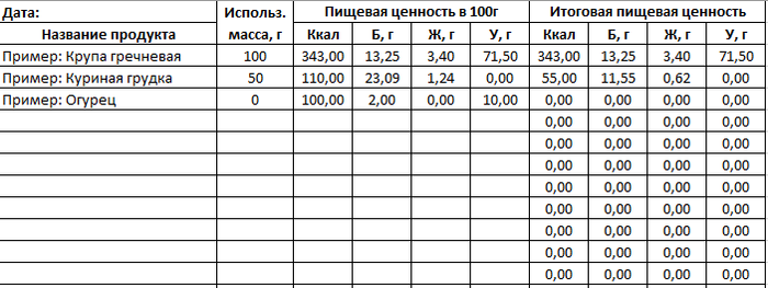 Берете употребляемые продукты, вносите его в таблицу, указывая его пищевую ценность с упаковки или интернета. Потом играетесь массой, чтобы получить близкие к норме результаты. Я обычно сначала набираю овощи/фрукты, потом добираю белок до 90%, добиваю крупами/пастой и провожу окончательную корректировку. Жиры обычно набираются сами с белковыми продуктами. Главное чтобы близко к норме были калории, остальное может немного колебаться.