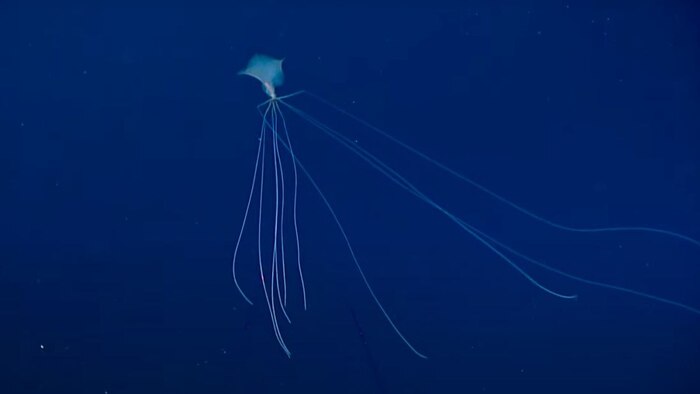 Первые упоминания о новом виде кальмаров появились в 1907 году, но полноценный фурор в науке произвели глубоководные съёмки в 2001 году на которых запечатлели странного кальмара с двумя большими плавниками по обе стороны тела и длиннющими щупальцами. Позднее было установлено, что длина его щупалец достигает 8ми метров. 😱