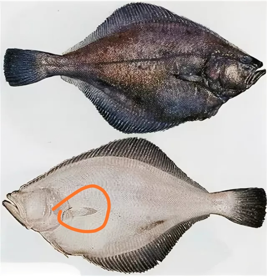 Молодь камбалы по внешнему виду не отличается от обычных рыб и плавает вертикально. До созревания мальки проходят все этапы изменений, которые происходили с камбалой в течение тысяч лет эволюции. Прячась от врагов, камбала приспособилась ложиться на дно, сливаясь с грунтом. Одним глазом наблюдать за тем, что происходит сверху неудобно, поэтому глаз рыбы, расположенный на нижнем боку, постепенно сместился наверх, на верхний бок.