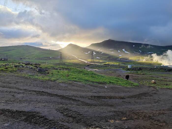 Ещё из плюсов - в себя пришёл быстро. Способствует и чистый воздух и ледяная вода в ручье, которой умываемся, рядом с заводом, который всю ночь жужжал. Мы возле него стоим лагерем. Это один из немногих заводов (Мутновская ГеоЭС) в мире, который вырабатывает Электроэнергию на термальные источниках. Но и вокруг него полная неухоженность. Его просто привезли на космическом корабле и воткнули в скалу. Не заботясь больше ни о чём. Такое здесь постоянно. Посмотрю пару фоток со вчера для поднятия тонуса, потенции и IQ и в бой – в счастливое будущее. Всем превед.