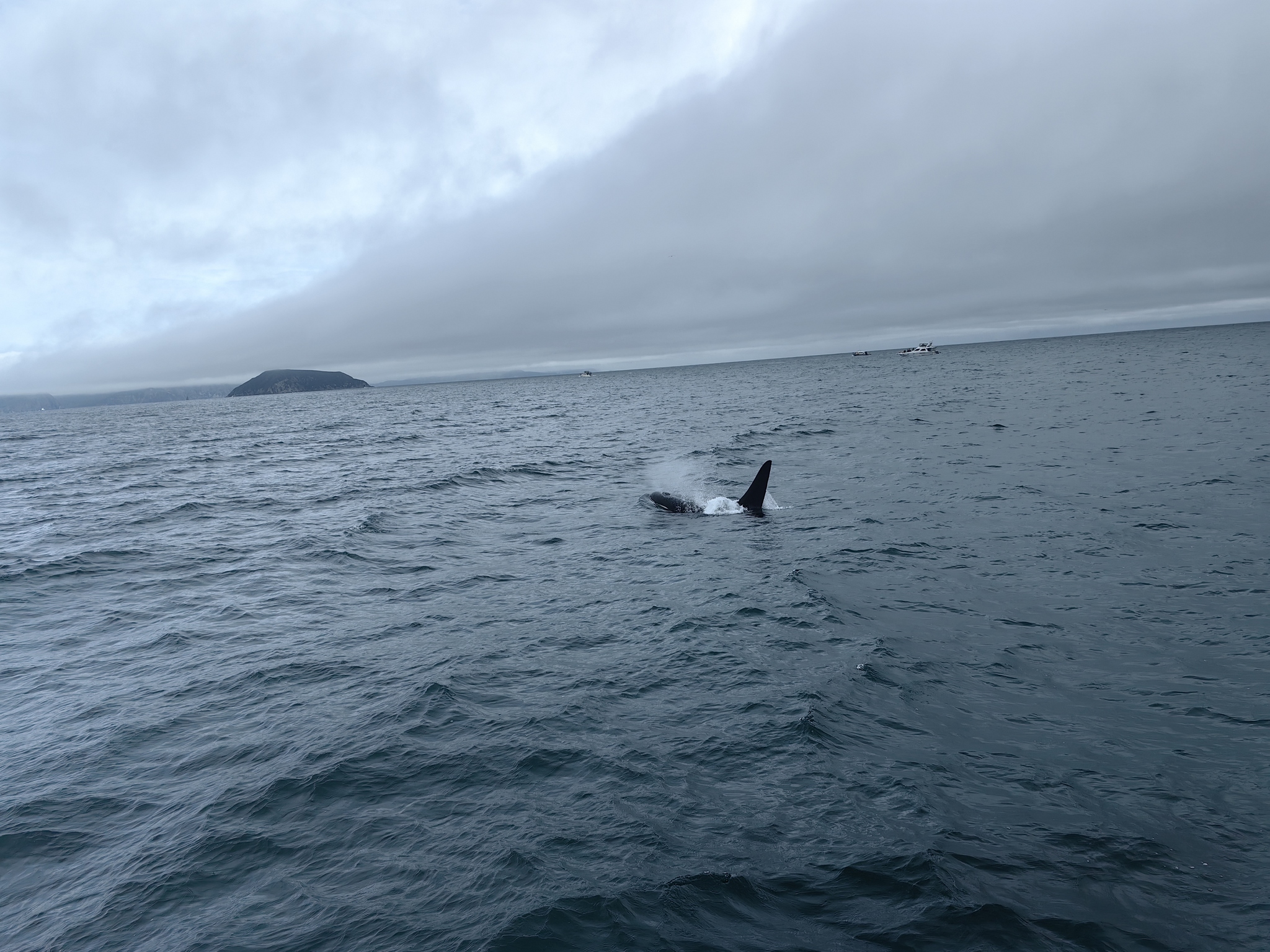 Через пол часа, раз два три четыре судна (примерно). Мой вгляд зацепил вдалеке большой плавник, который ушел под воду. Дошло. КОСАТКА!