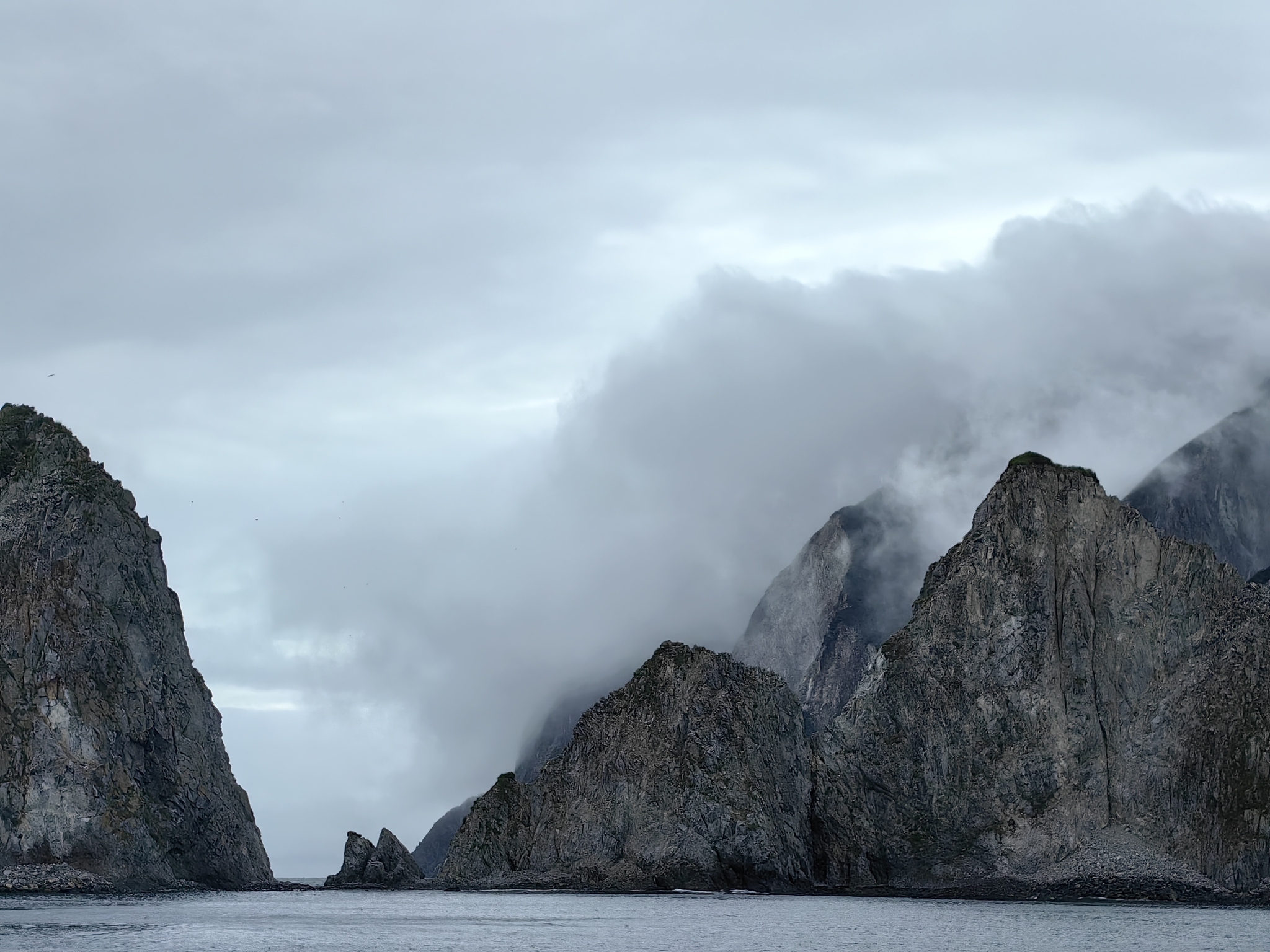 Сначала я их даже не заметил. Я был заворожен игрой туманов и волн, передо мной открылась суровость столкновения волн океана и скал. Эффекта добавляли порывы ветра, я был очень вдохновлен в этот момент. А потом увидел их