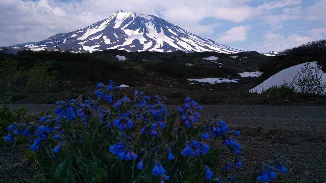 Недавно распустившиеся цветочки, рядом мноого снега, вулкан и +26°