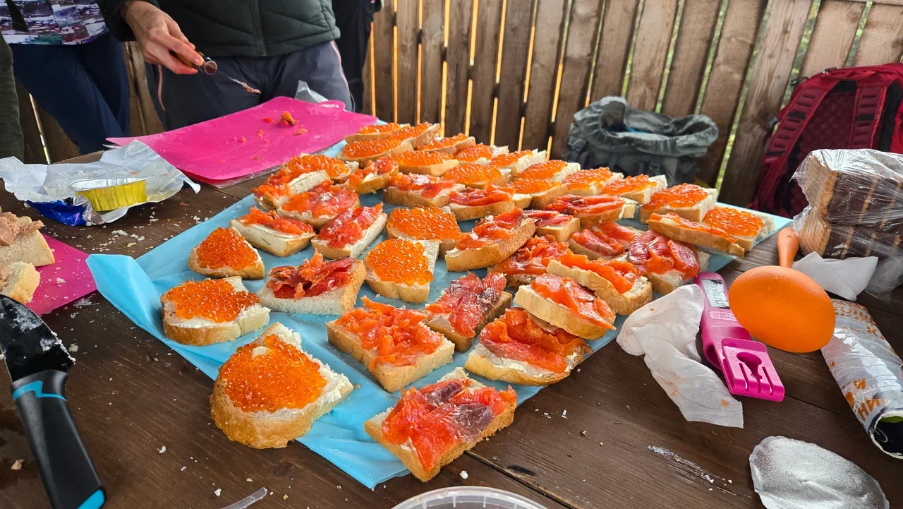 Доехали до лагеря рядом с Авачинским кордоном, разгрузились. Пока все ставят лагерь, дежурные готовят ужин. К приветственному ужину бутерброды с икрой и красной рыбой! Вот бы так каждый день! За ужином знакомимся, каждый рассказал немного о себе. Запомнить всех сразу не реально! В группе 18 человек, да трое инструкторов.