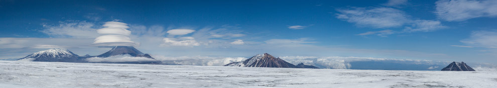 Вид с ледника вулкана Плоский Толбачик. Словно подушками укрыты Лентикулярными облаками вершины самых высоких вулканов Камчатки Ключевской и Камень. За этим снимком я охотился лет пять. Слева на право вулканы: Ушковский, Камень, Ключевской и слегка дымящийся Безымянный. Кликабельно: http://loveopium.ru/content/2015/05/kamchatka/05big.jpg
