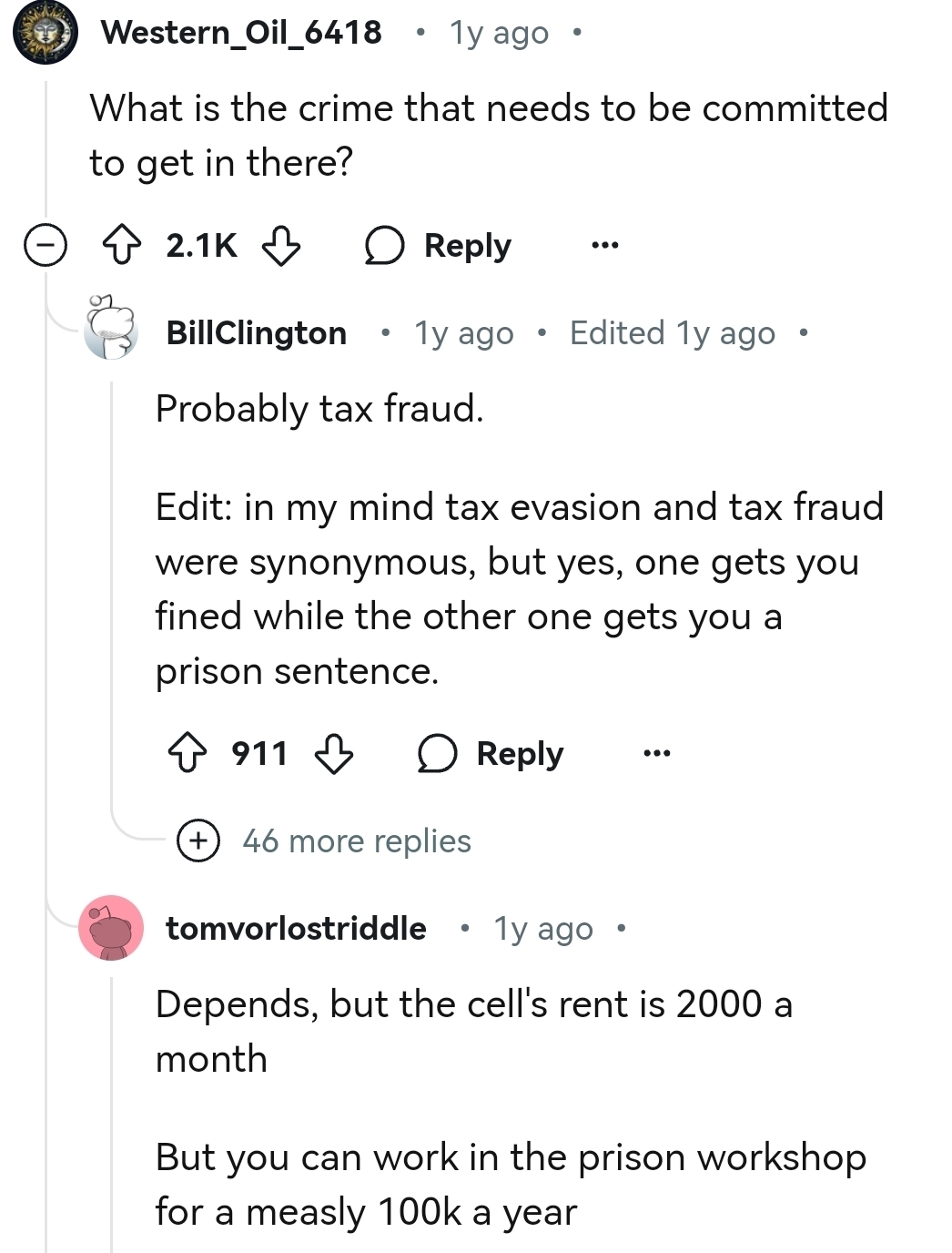 Пишут, что это не простая тюрьма, туда сажают за не сильно криминальные статьи, например, неуплату налогов, а сама аренда такой ячейки платная, 2к евро в месяц, но можно работать в тбремной мастерской.