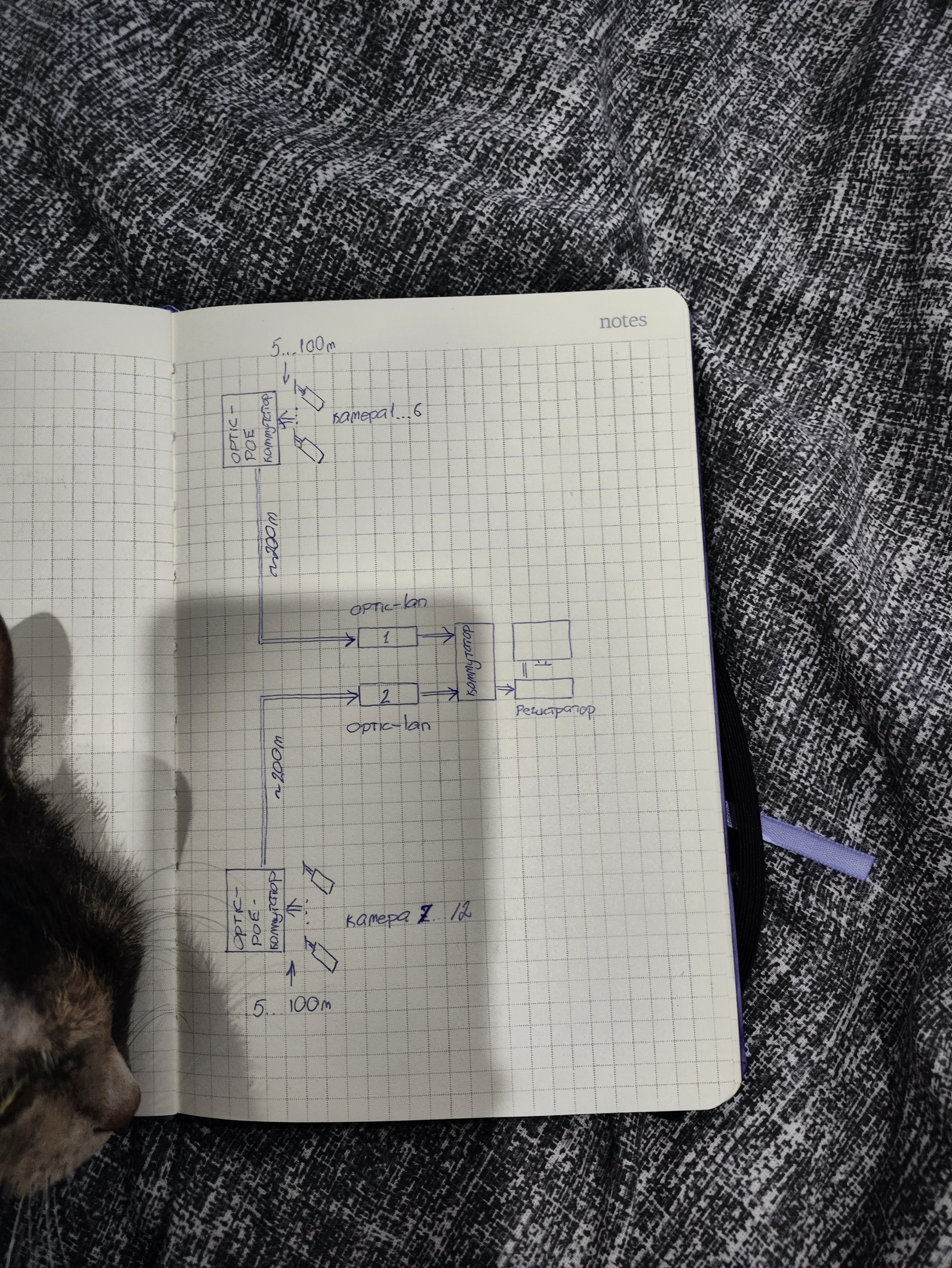 Суть: от здания, где будет установлен регистратор расходятся две линии в противоположных направлениях. Каждая с максимальной удаленностью по 300м. На линиях по паре камер на 100м, 200м и 300м.