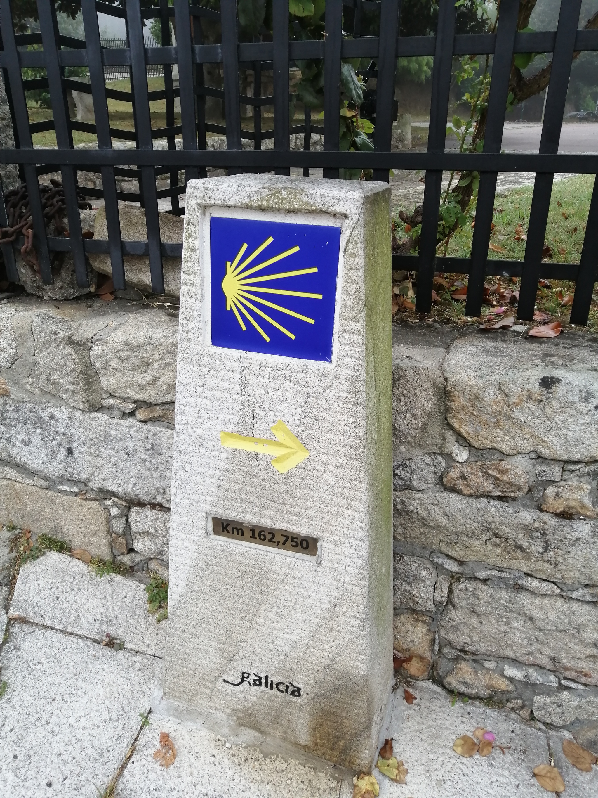 Испания порадовала нас стандартизацией желтых стрелочек. Если в Португалии стрелки были нарисованы где попало, то в Испании регулярно расставлены камни с оставшимися до Сантьяго километрами (см. фото).