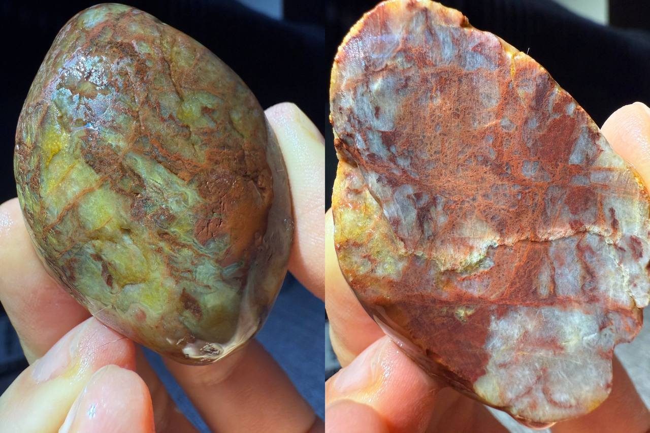 Когда-то по трещинам в породе гуляли кремнистые растворы, они заполняли пустоты халцедоном, а железо подкрашивало всё это в красные оттенки. В итоге снаружи — обычный камень, а внутри — узоры, полосы и сюрпризы.