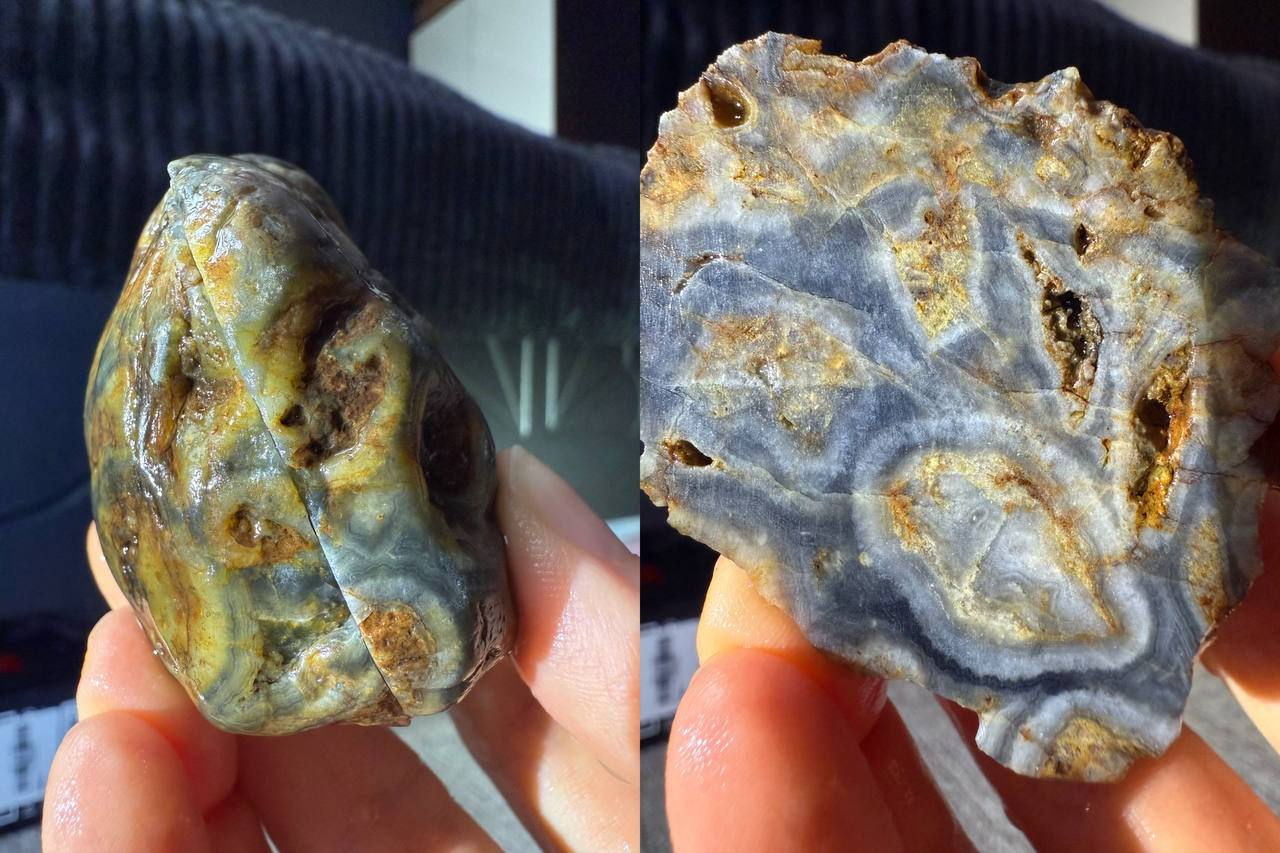 Если честно, от этого образца я ожидала большего. Очень красивый и пёстрый он был снаружи. Тем не менее эти агатовые узоры завораживают. После шлифовки рисунок должен стать ярче.