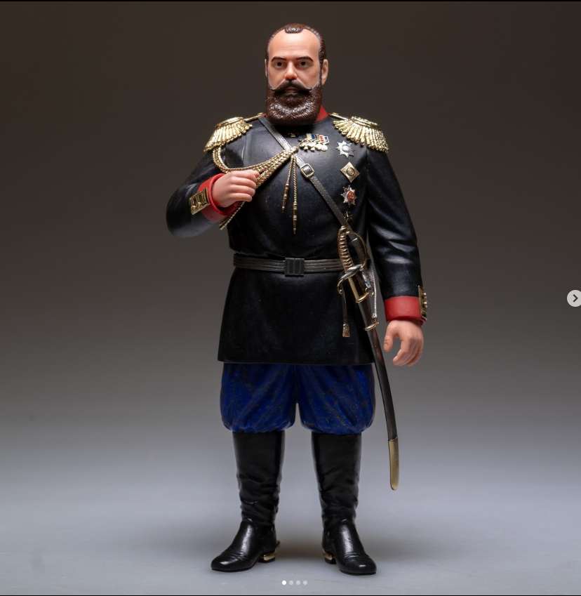 Мундир и сапоги монарха выполнены из чёрного нефрита. Брюки созданы из небесно-голубого лазурита, а манжеты и лампасы из ярко-алой смальты. Золото и серебро послужили материалами для изготовления эполетов, орденов и других металлических деталей. Лицо и руки Александра выполнены из кахолонга. Окладистая борода и волосы царя сделаны из яшмы оттенка горького шоколада.