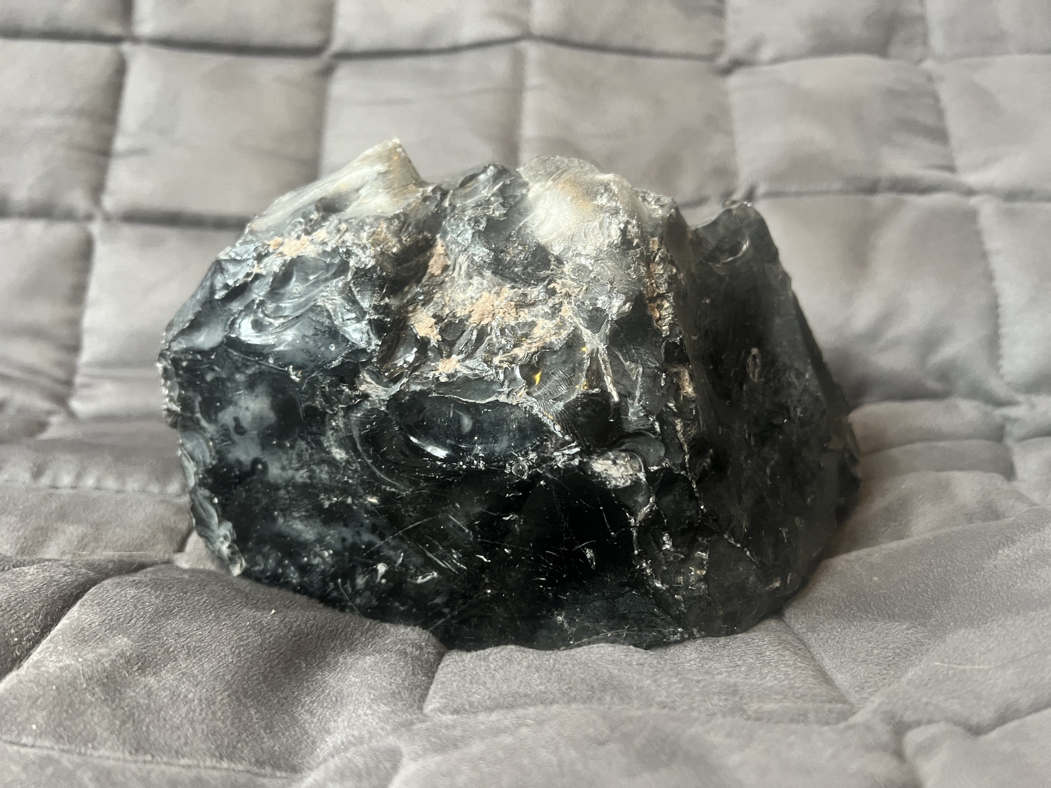 Обсидиан - вулканическое стекло, твердый, но хрупкий, травмоопасный, так как при разрезании или обтачивании очень любит скалываться тонкими платинами или иглами, который замечательно режут руки. Работать обязательно в очках, т.к. летят мелкие осколочки, которые могут травмировать глаза. Зато он замечательно полируется и не дорого стоит, так что, если соблюдать технику безопасности, работать с ним одно удовольствие, я тут уже показывала котика из черного обсидиана, там, кстати, на фото процесса можно заметить окровавленный палец ))