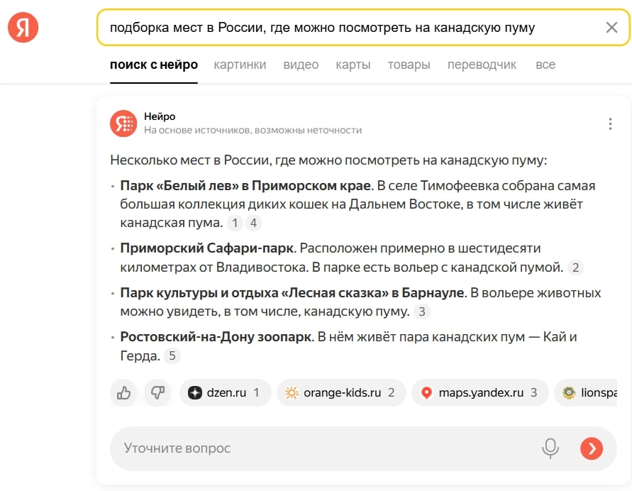 Есть еще несколько мест, куда можно поехать в путешествие и встретиться с канадской пумой. Поиск с Нейро выдает, что в России расположены вот такие парки с представителями этого вида кошачьих: