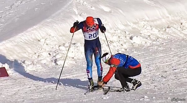 Россиянин Антон Гафаров сломал лыжу, но все-таки ему удалось закончить гонку благодаря канадскому тренеру Джастину Уодсворту, который помог ему.