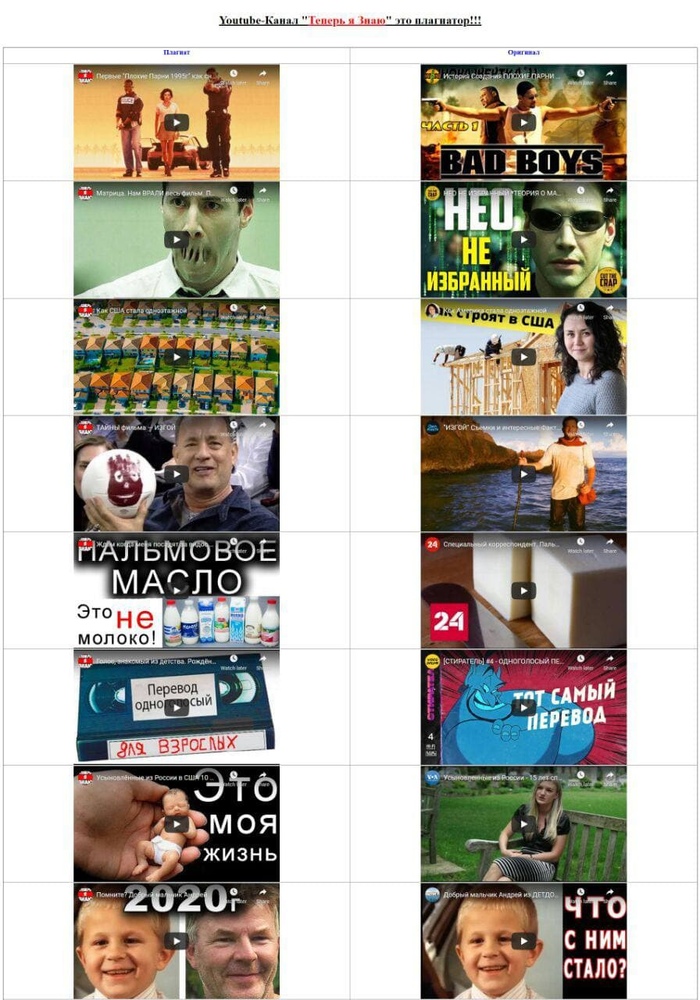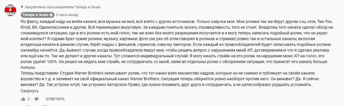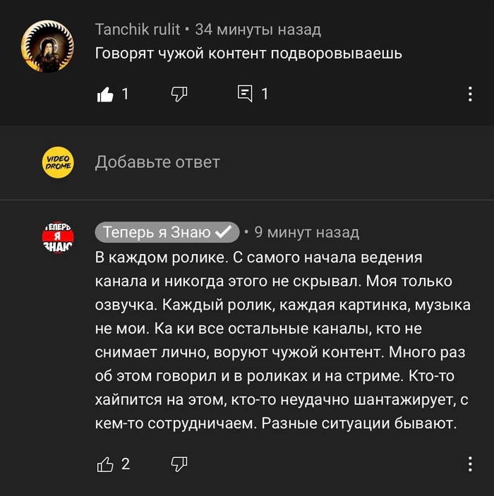 Сразу говорю, что это не реклама канала. Недавно на канале VIDEODROME у которого условно говоря 100 тысяч подписчиков, и обзоры у него исключительно на тему "Фильмов". Самый популярный ролик на его канале про "Одноголосый перевод 90-х годов", в нем автор рассказывает про все одноголосые переводы, которые были на рубеже 80-х, 90-х годов. В общем у парня реально интересные и смешные видео. Спустя неделю у него появился на канале стрим, в котором он рассказывал, что у него украли контент. Контент украл канал под названием "Теперь я знаю" у которого 2 650 000 тысяч подписчиков и выложил ролик под названием "Голос, знакомый из детства. Рождённые после 2000-го вышли из чата)". Автор канала "Теперь я знаю", просто украл его текст и переговорил его своими словами, в точности как у "VIDEODROME", просто добавив от себя пару слов. Плагитор даже не указал в описании, что взял чужие материалы из другого видео. Подписчики "VIDEDROME", написали кучу негативных комментариев под видео плагиатора, он их естественно удалял а потом и вовсе закрыл комментарии. Автор канала "VIDEODROME", написал ему с просьбой удалить отрывки и куски из его видео, но тот ответил ему, что правилами это не запрещено и якобы куски из видео у "VIDEODROME" тоже принаджелат 3-им лицам, и соотственно сказал, что удалять его он не собирается. Потом плагиатор в одном из комментариев ответил, что он предложил бесплатно рекламу автору канала "VIDEODROME", а тот в ответ отказался и потребовал у него 300 тысяч рублей и начал его шантажировать, и мол пригрозил ему, что он заплатит в итоге 600 тысяч рублей. Парень якобы хайпится и зарабатывает. Автора канала "VIDEODROME" я очень хорошо знаю, его зовут Степан, требовать и шантажировать он никогда бы не стал. Видел много монстр-каналов с огромным количеством подписчиков, которые крали ролики у каналов с маленькой аудиторией. Но самое обидное, что Степан пишет сценарий сам, делает контент не один, ему помогают в этом Борис VHS Страхов в озвучке его видеороликов, и еще пара друзей записывают ему авторскую музыку. И самое комичное, что написано у автора канала Теперь я знаю в описании, цитирую: "P.S. все идеи, сценарии, монтаж общение с Вами я делаю исключительно сам. Хоть данный объем другие каналы делают минимум в коллективе из 4 человек! Поэтому, если мой организм, однажды, скажет "да ну нафиг я в отпуск!", видео могут не выходить некоторое время, но в скором времени я всё же вернусь! Как и всегда возвращался)ПэПээс. это вообще кто-нибудь читает?)