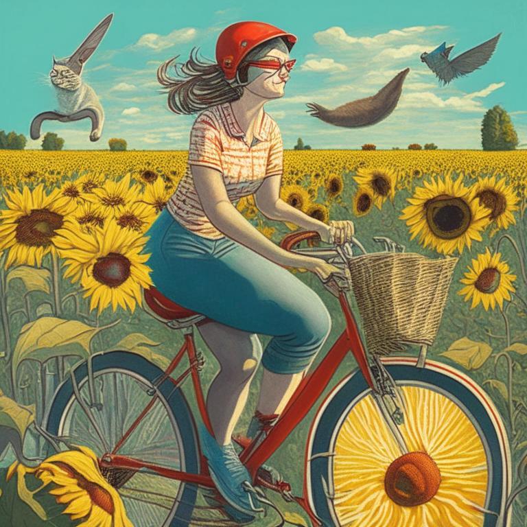 Мое любимое: Женщина едет на велосипеде. Цвет велосипеда красный. На фоне поле подсолнухов. В корзине на руле велосипеда сидит серый кот