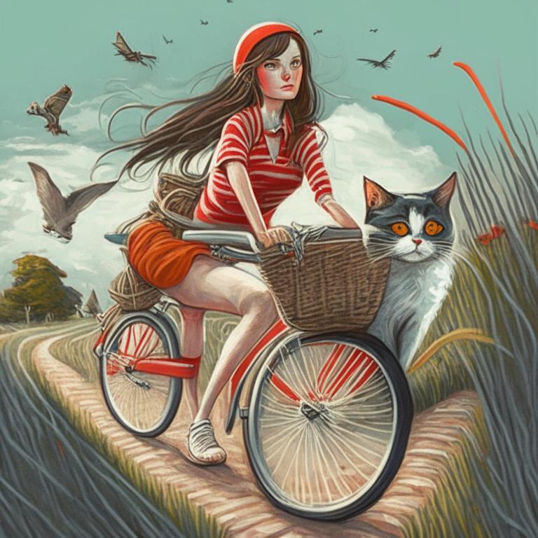 Девушка брюнетка на красном горном велосипеде едет по тропинке в поле. На багажнике велосипеда корзинка, там сидят два кота: серый полосатый кот и белый кот