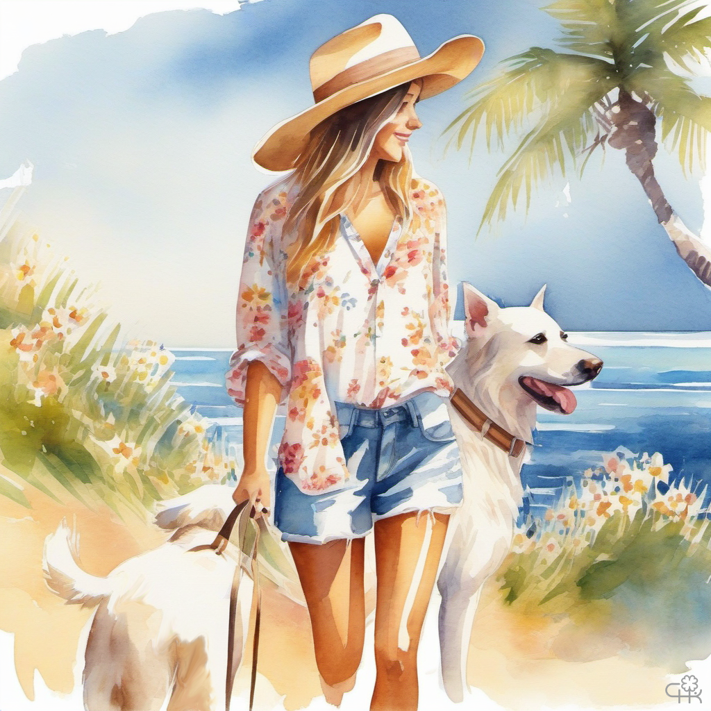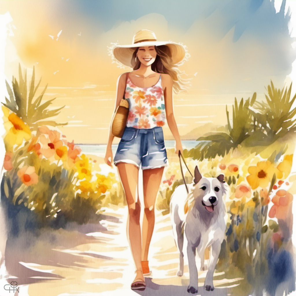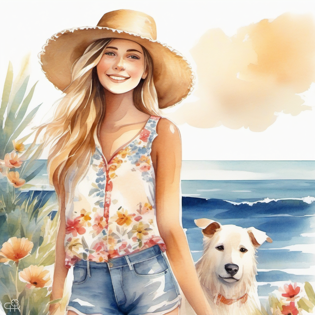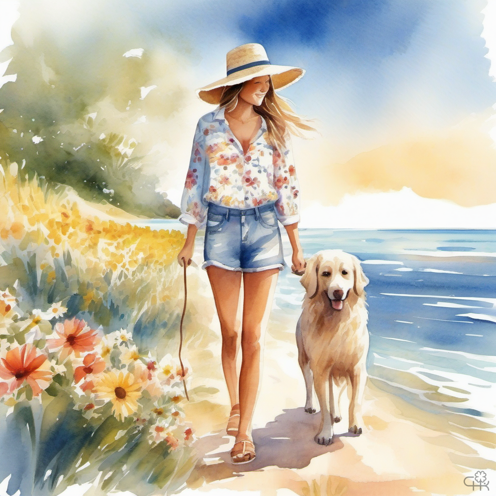 22 LuckySweet001 Нейро_Арты Серия Ах, лето... Каникулы на море 2 года назад [моё] Лето Море Акварель Этюд Шорты Солнце Отдых Прогулка Арты нейросетей Длиннопост Девушки Собака 1 Ещё 0