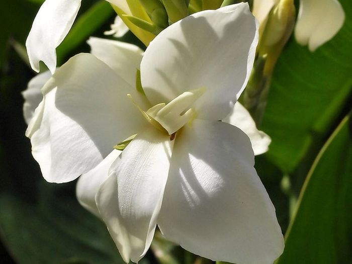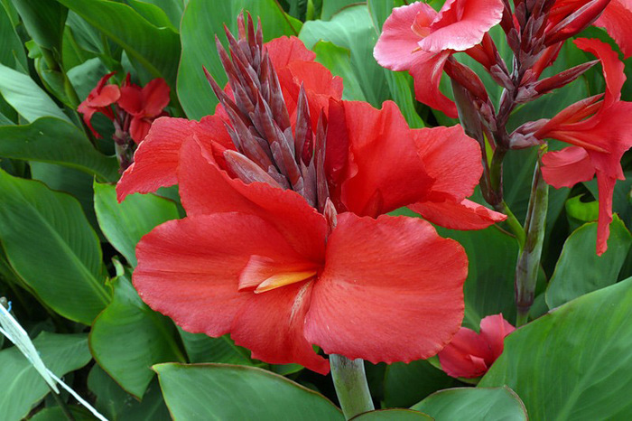 Современные сорта канн имеют очень красивые крупные листья разнообразных расцветок- зеленые, фиолетовые, красные, желтые, полосатые. И над ними возвышаются великолепные цветы любого цвета радуги-оранжевые, розовые, желтые, белые, в крапинку.