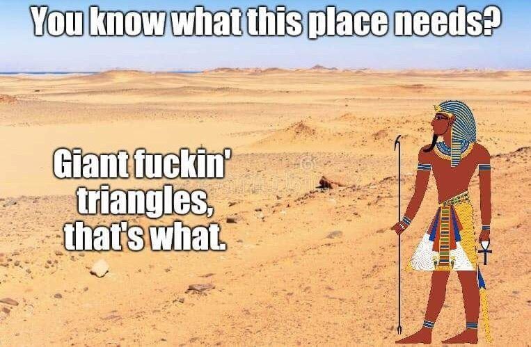34 Beretta911 Капризы заказчика 7 лет назад Знаешь, что этому месту не хватает?Огромных гребаных треугольников, вот что. 9GAG Египет Египетские пирамиды Пустыня Заказчики