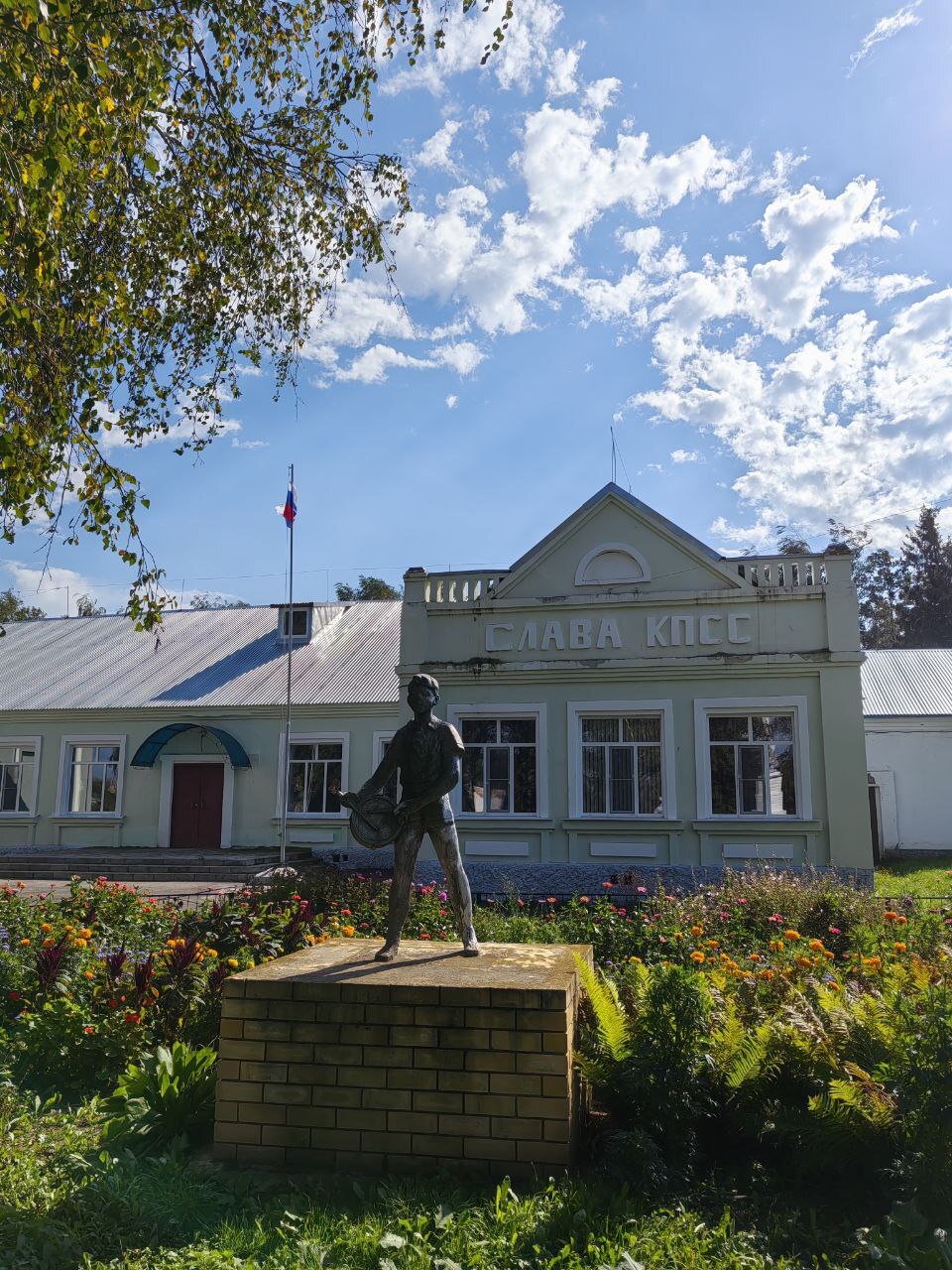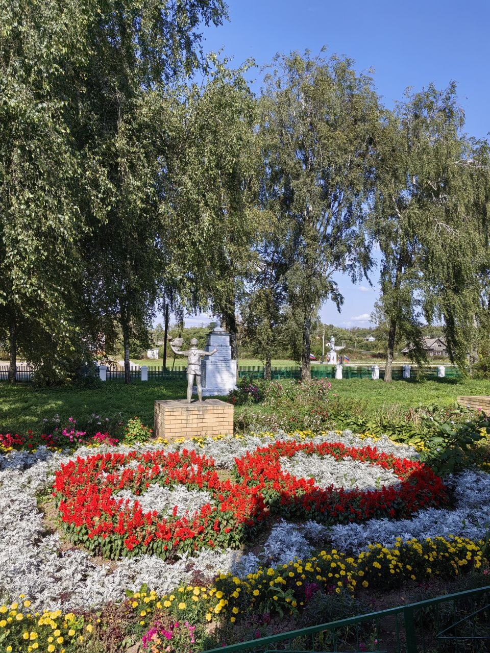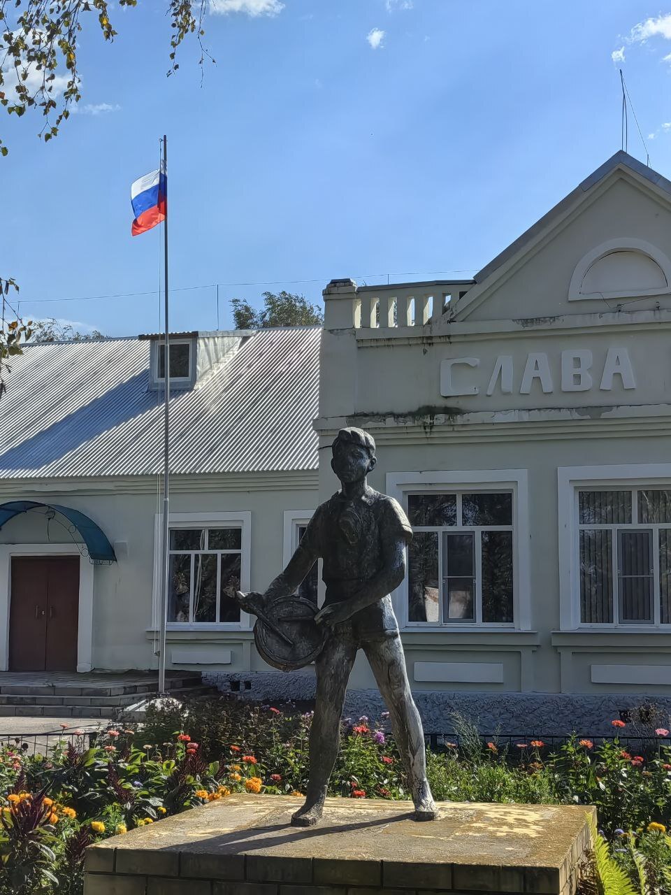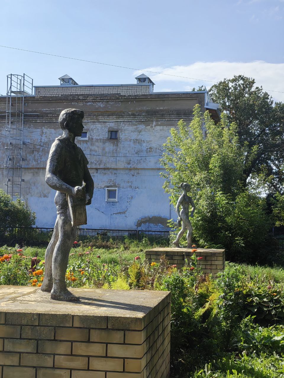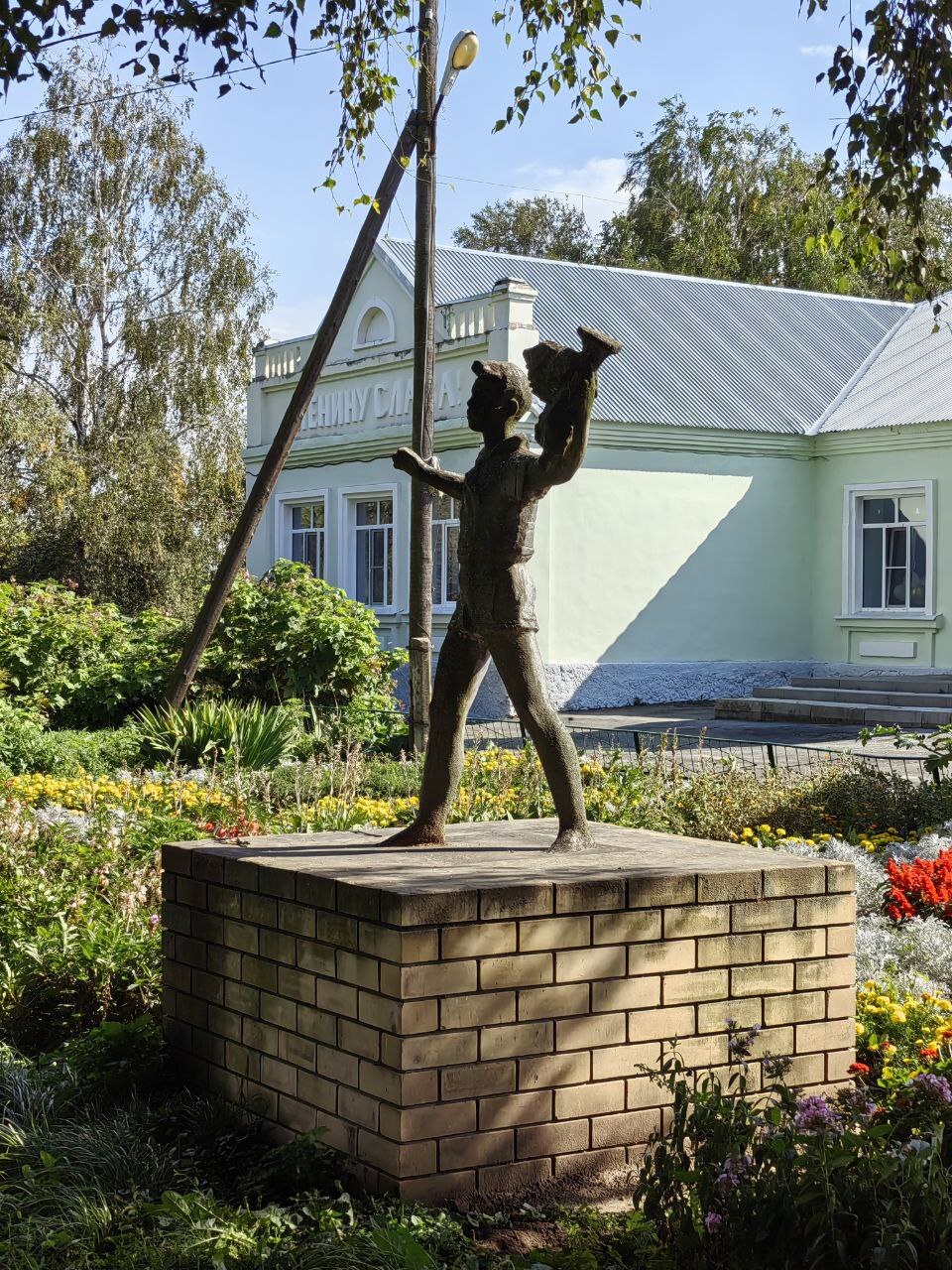 А здесь у нас скромная девочка. Она поливает из лейки бетонный постамент свой, чтобы он не рассохся от жары. Жаль ребят - и в жару и в холод они вот так вот, в шортиках тут стоят и не могут уйти по своим ребячьим делам.