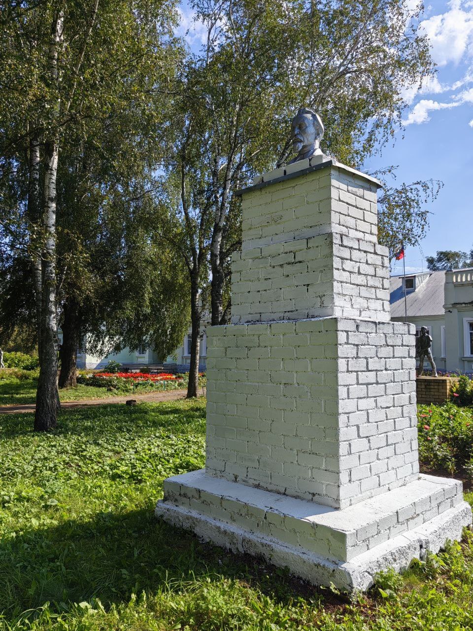 Чуть поодаль, слева от входа располагается "Дедушка Ленин". Ни кто уже не помнит какой Лены этот дедушка и жива ли сама Лена, но её дедушка навечно запечатлён в наших сердцах и общественных скульптурах и памятниках. И тоже остаётся вопрос: - Почему по шею?