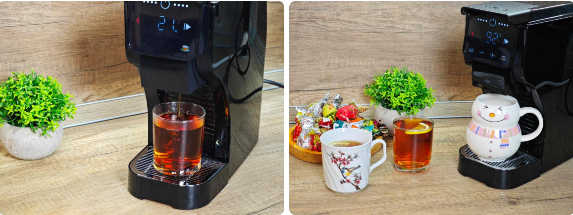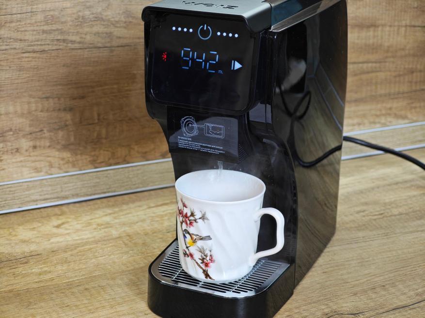 Кофемашина действительно компактная — без проблем поместилась на кухне/на рабочем столе. Для включения нажимаю на сенсорную кнопку («Питание») и жду около двадцати секунд. Вода разогревается. При первом запуске я промываю кипятком трубки, то есть перевожу кофемашину в режим работы термопота, нажав на кнопку подачи воды (стрелочка справа) в течение трех секунд. Первую порцию кипятка после промывки сливаю. Эту процедуру можно повторять примерно раз в неделю. Далее, регулируем объем под свои чашки и кофемашиной можно пользоваться по назначению. В том числе так и в качестве термопота.
