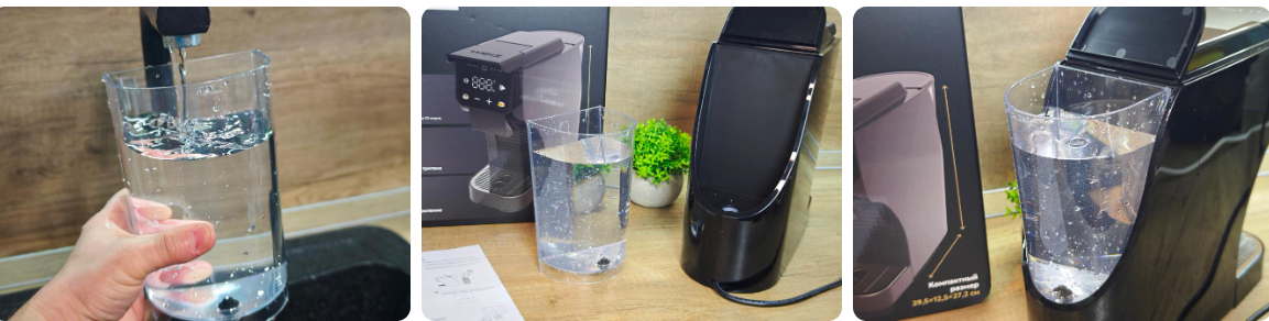 Что касается ёмкости, которая предназначена для залива чистой питьевой воды, то заявлен материал тритан — прозрачный и прочный пищевой пластик. Конструкция резервуара дает возможность добавлять воду внутрь без снятия резервуара. Но и снять полностью резервуар с корпуса не составляет труда.