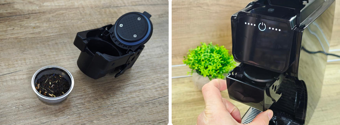Однако настоящая универсальность кофемашины Weiz проявляется за пределами работы с готовыми капсулами. Речь идет про приготовления кофе/чая с помощью лотка-держателя для перфорированных чашек. Данный лоток, по своей сути, является универсальным адаптером, позволяющим засыпать молотый кофе/листовой чай/травяные сборы и даже использовать кофе/чай в пакетах.