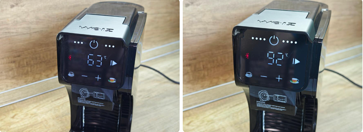Управление осуществляется с помощью сенсорных кнопок на дисплее. При старте происходит быстрый разогрев порции воды для приведения кофемашины в активное состояние. Занимает этот процесс примерно 25-35 секунд. Рабочее значение температуры на дисплее равняется 92 градусам.