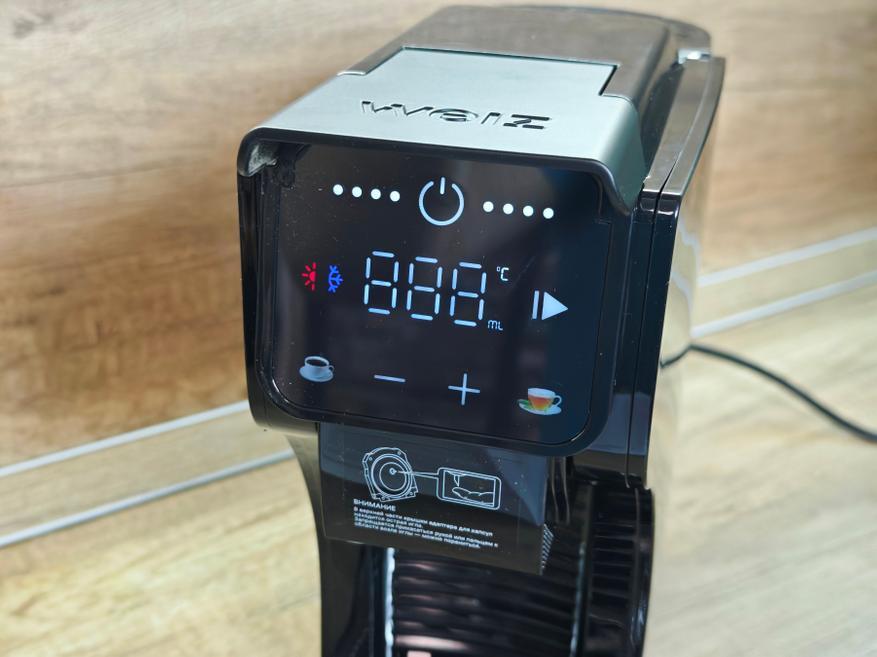 Дисплей прикрыт полупрозрачной черной панелью — индикаторы просвечиваются сквозь пластик. Располагается прямо над лотком-держателем, так что управление всегда будет доступно, даже если установите кофемашину в узкое место. На дисплейной панели предусмотрены индикаторы горячего/холодного режима, символы для указания объема чашки и температуры, а также дополнительные индикаторы кнопок и активного режима.