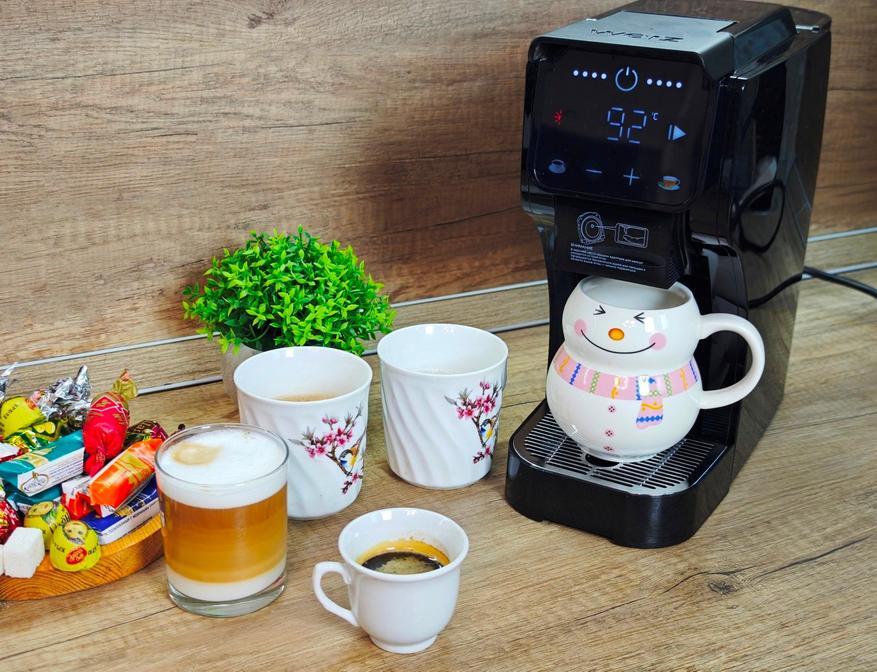 В целом впечатления от кофемашины Weiz положительные. Хотелось бы отметить в плюсах повторяемый результат (стабильный вкус кофе), контроль температуры, выбор объёма чашки под разные предпочтения у членов семьи, возможность снижения стоимости при использовании более доступных капсул сторонних производителей, в том числе и кофе собственноручного помола, (например, авторских блендов в универсальном лотке). Конечно, у подобных кофемашин есть и минусы. Например, это достаточно высокая стоимость капсул. Но будет честным отметить, что хороший кофе в зернах также стоит довольно прилично. В качестве компромисса можно использовать молотый кофе — это не только альтернатива использованию капсул, но и возможность попробовать новые вкусы/бленды. Лично мне не хватает капучинатора, но в подобных машинках он редко встречается, проще приобрести отдельный электрический вспениватель молока, что я и планирую сделать. Что же касается частого приготовления, то у этой модели Weiz увеличенный контейнер для воды до 1000 мл, то есть можно спокойно приготовить 4-5 чашек кофе. Кофе получается вкусный, приготовление быстрое, сбросить капсулу после использования — вообще занимает считанные секунды.
