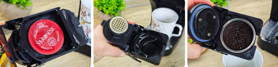 Одна из неоспоримых положительных черт капсульных кофемашин — это элементарный уход и минимальное обслуживание после цикла приготовления. Если говорить про капсулы, то достаточно просто сбросить капсулу после использования — вообще занимает считанные секунды. На фотографиях ниже использованные капсулы Неспрессо и ДольчеГусто. А вот чашу в универсальном лотке приходится тщательно промывать после процесса приготовления молотого кофе. Это напоминает уход за рожковыми кофеварками.