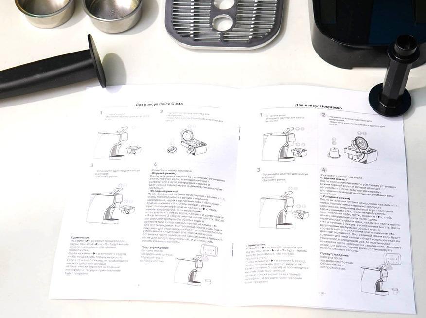 Дополнительно в комплекте вы найдете держатель для капсул типа ДольчеГусто. Это крупные капсулы, которые бывают не только с кофе, но и с сухими сливками и даже с шоколадом. Предусмотрены механизмы, аналогичные таким в оригинальной конструкции, в том числе и игла для прокалывания.
