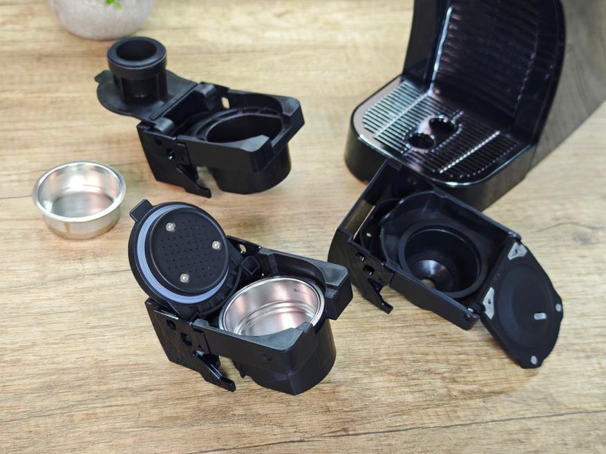 Металлическая ручка дополняет образ современного аппарата. Благодаря нескольким держателям-лоткам, которых в комплекте аж три штуки под разные стандарты, можно использовать популярные капсулы от Неспрессо/ДольчеГусто, а также заваривать молотый кофе и даже чай. Даже есть возможность экспериментировать с сортами, обжарками и блендами имея такую универсальную кофемашину.