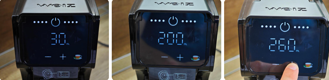 Сенсорные кнопки в нижней части панели позволяют не только включать или выключать аппарат, но и выбирать нужный режим приготовления, а также регулировать температуру и объем чашки.