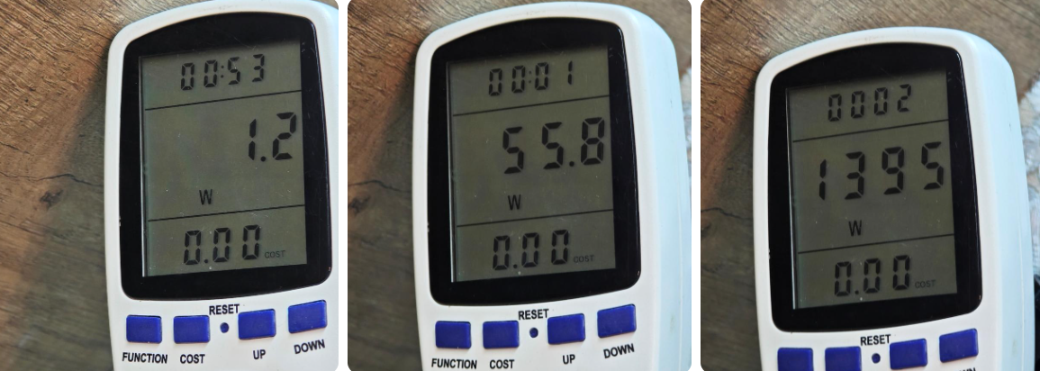Прикладываю оценку потребления. Отмечу три основных режима: это режим ожидания (потребление около 1 Ватта), режим работы помпы (в этом случае помпа «берет» около 55 Вт при работе), а также режим нагрева (ТЭН при разогреве потребляет до 1400 Вт). Основное потребление идет на старте (подготовка к работе). После разогрева потребление заметно уменьшается и находится в пределах от 100 до 1300 Вт в зависимости от режима работы, в том числе при заваривании порции напитка. Если используется часа объема выше среднего, то в процессе может включатся ТЭН для подогрева дополнительного объема воды.