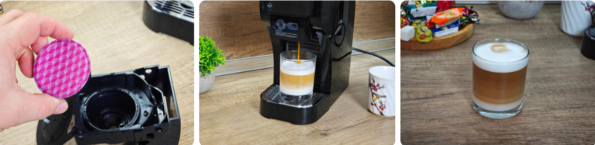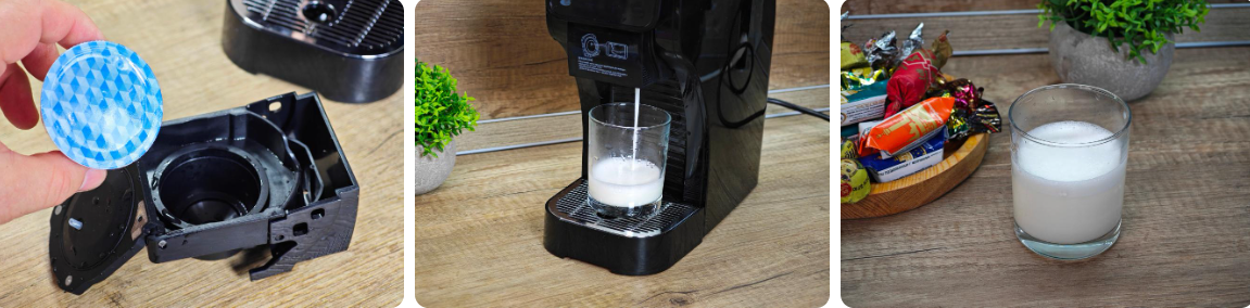 Стоит отметить, что комбинируя вот такие капсулированные сухие сливки с топпингами или иными добавками, используя функцию термопота можно приготовить совершенно разнообразные напитки. Например, латте-макиато/айслатте и даже горячий шоколад. Не забывайте промывать лоток после молочной капсулы.