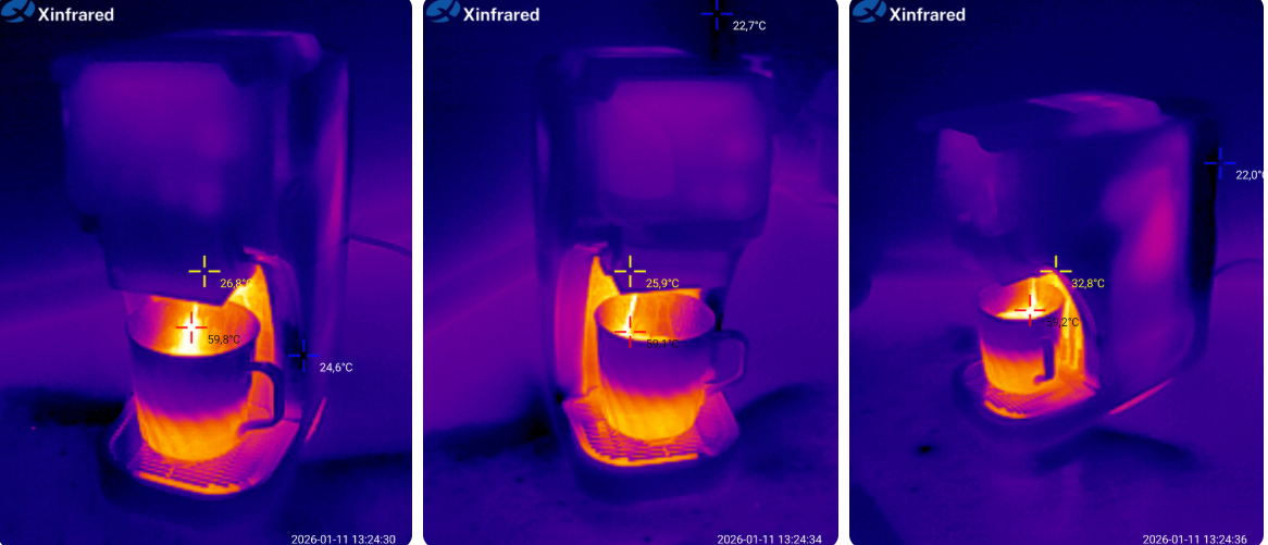 Учитывая, что нагрев корпуса машинки при работе является минимальным, то её можно устанавливать близко к другой технике или в узкие места, например, на полку кухонного гарнитура. Тепловизор показывает слабый нагрев панелей при работе (чуть выше комнатной температуры). Заметная температура начинается в рабочей зоне (горячая струйка кофе, лоток с горячей капсулой, сама чашка с кофе).