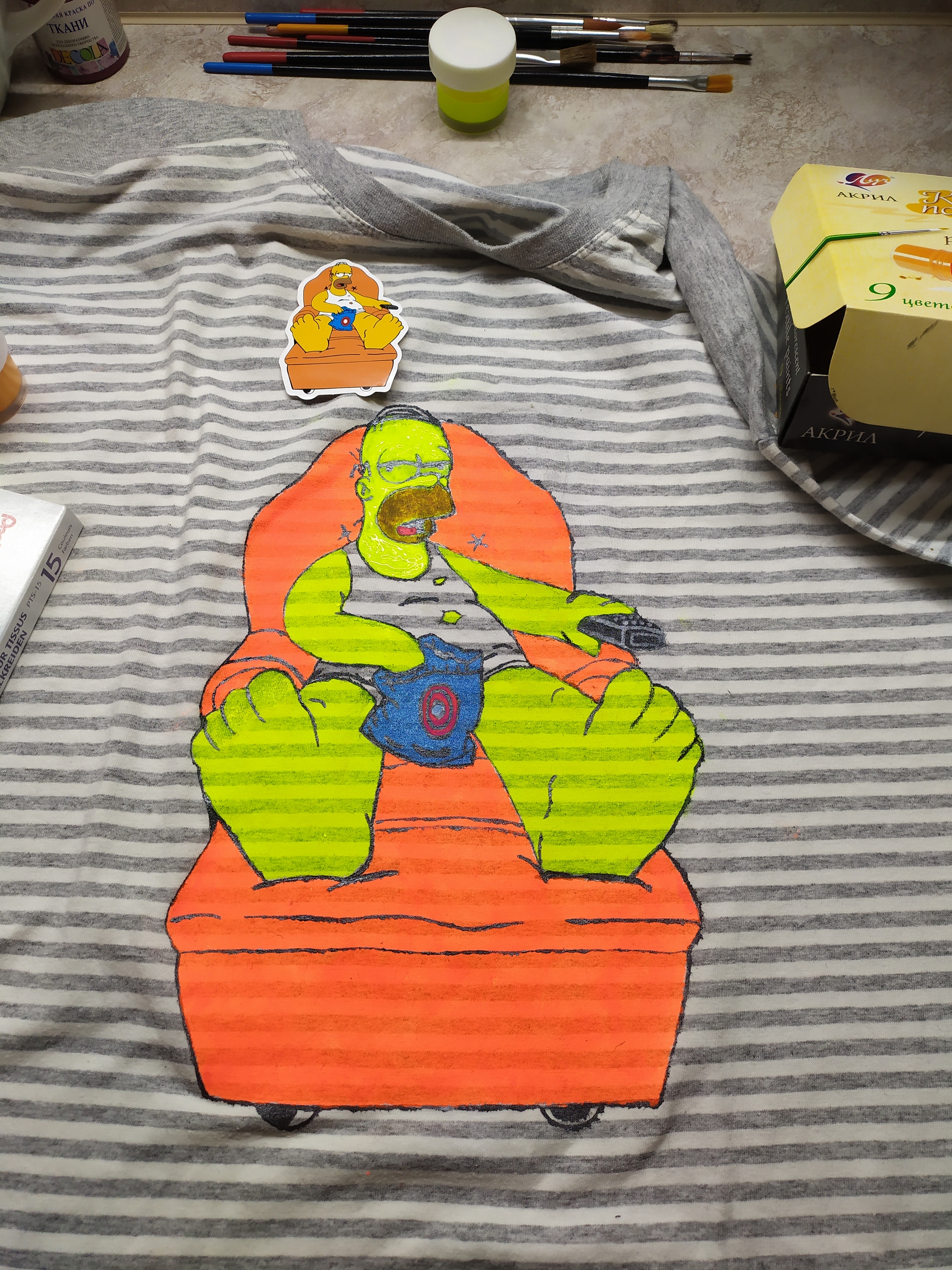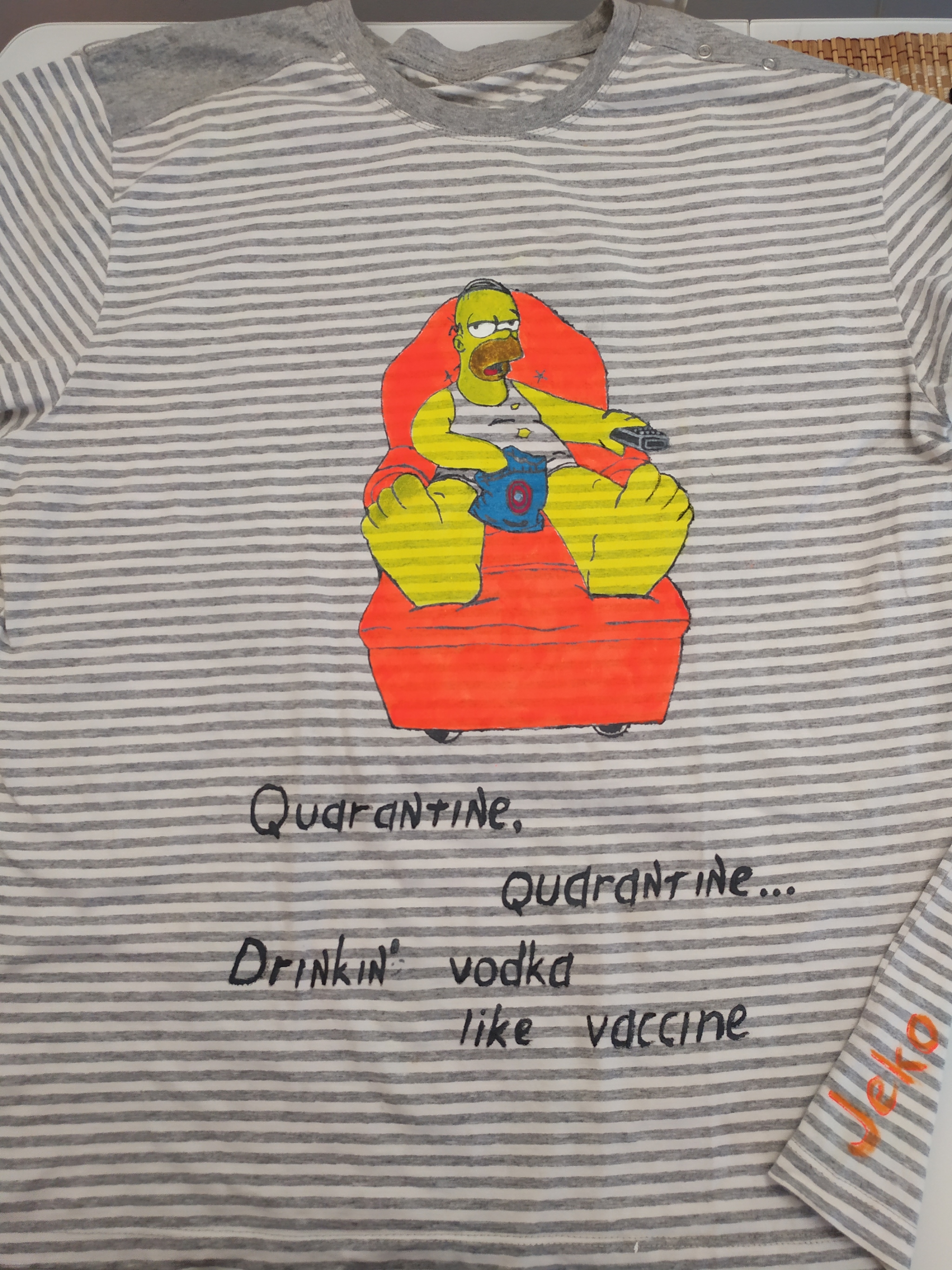 Пока товарищ был на карантине по известной всем болезни, я решил ему поднять настроение . Отрыл футболку в шкафу, когда- то приобретённую в сэконде за символическую сумму. Достал кисти и краски( не самые хорошие для росписи по ткани). Но я не профи и решил порисовать недорогими, а если понравится и втянусь, то куплю хорошие.