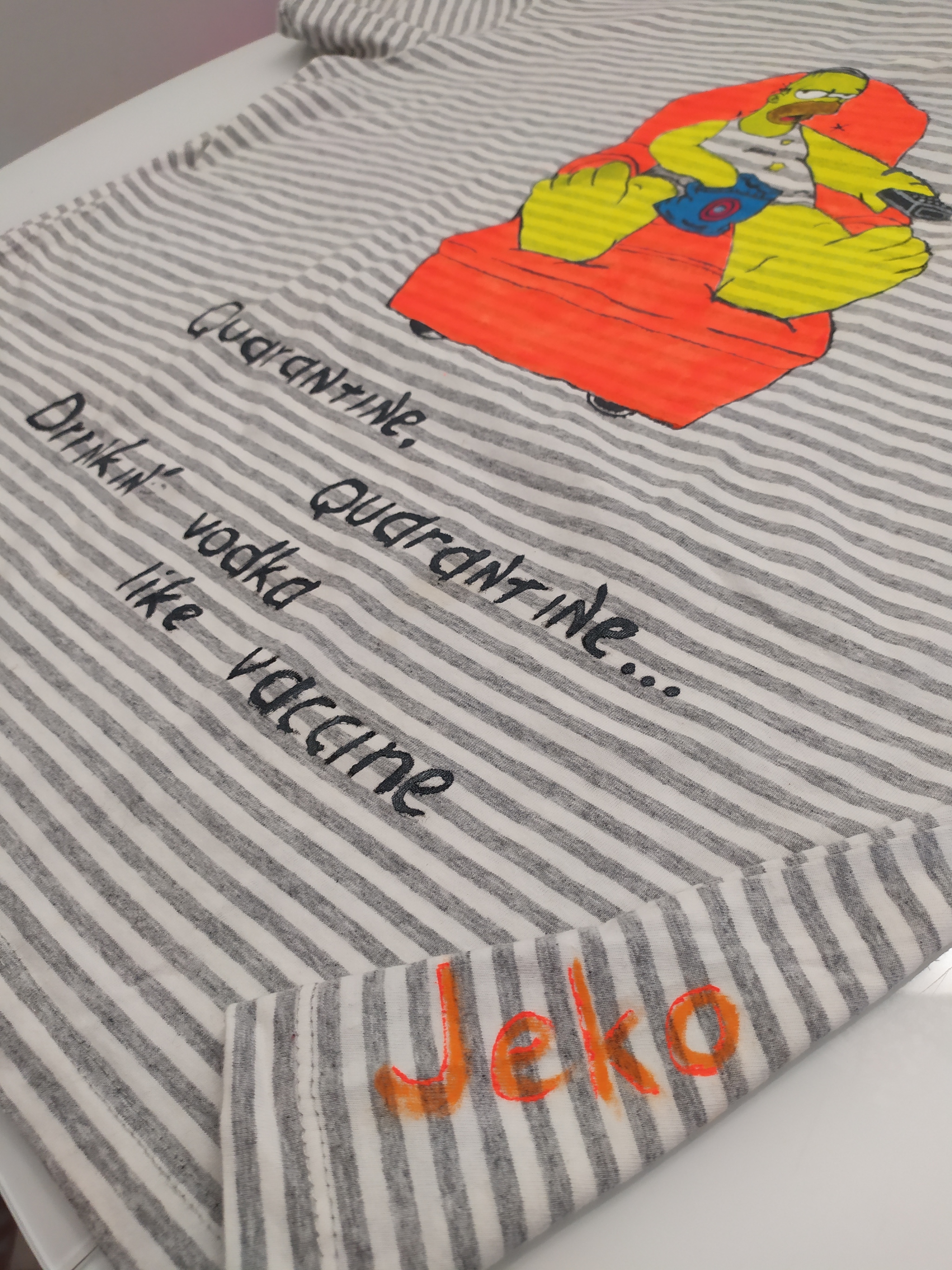 Изображение закончено, пара придумать слоган. Услышав весёлый трэк в наушниках, решил взять фразу из припева, заменив виски на водку. Пытался максимально подобрать Simpson'овский шрифт, но у меня, кажется не очень получилось. Закончил, закрепил утюгом, и подарок отправил. Получатель оценил и остался доволен, хотя я и пролетел с выбором размера футболки.