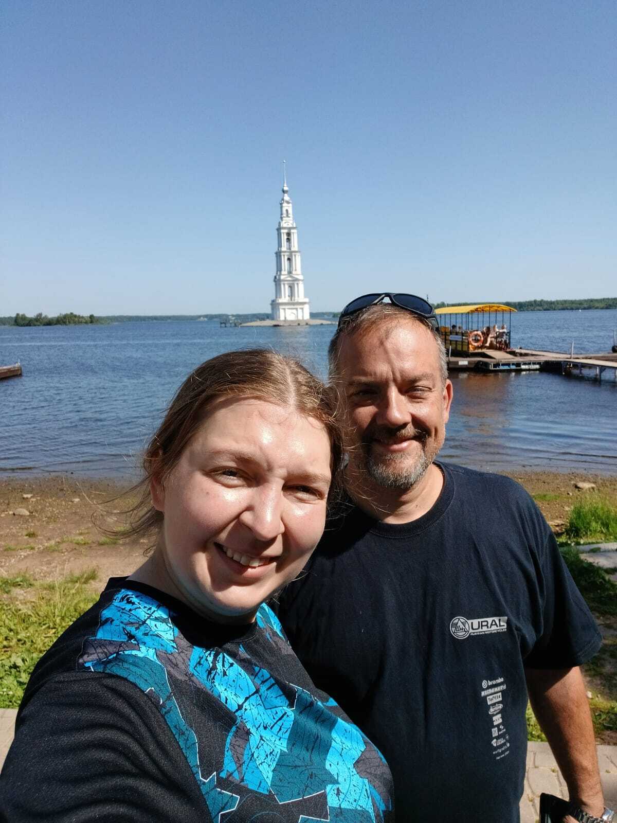 В Калязине фотографируемся со знаменитой колокольней и обедаем в кафе при шикарном, недавно открывшемся дорогом отеле на берегу. Пока мы отдыхаем, подъезжают и уезжают мотоциклисты, в основном почему-то на Харлеях, туристические автобусы высаживают экскурсионные группы. Не перестаю удивляться, почему власти и бизнес Калязина никак не используют его огромный туристический потенциал: ни летних кафе на берегу, ни киосков с сувенирами, ни официальных экскурсий. Даже воду или мороженое купить негде. Хорошо, хоть этот дорогущий отель открылся.
