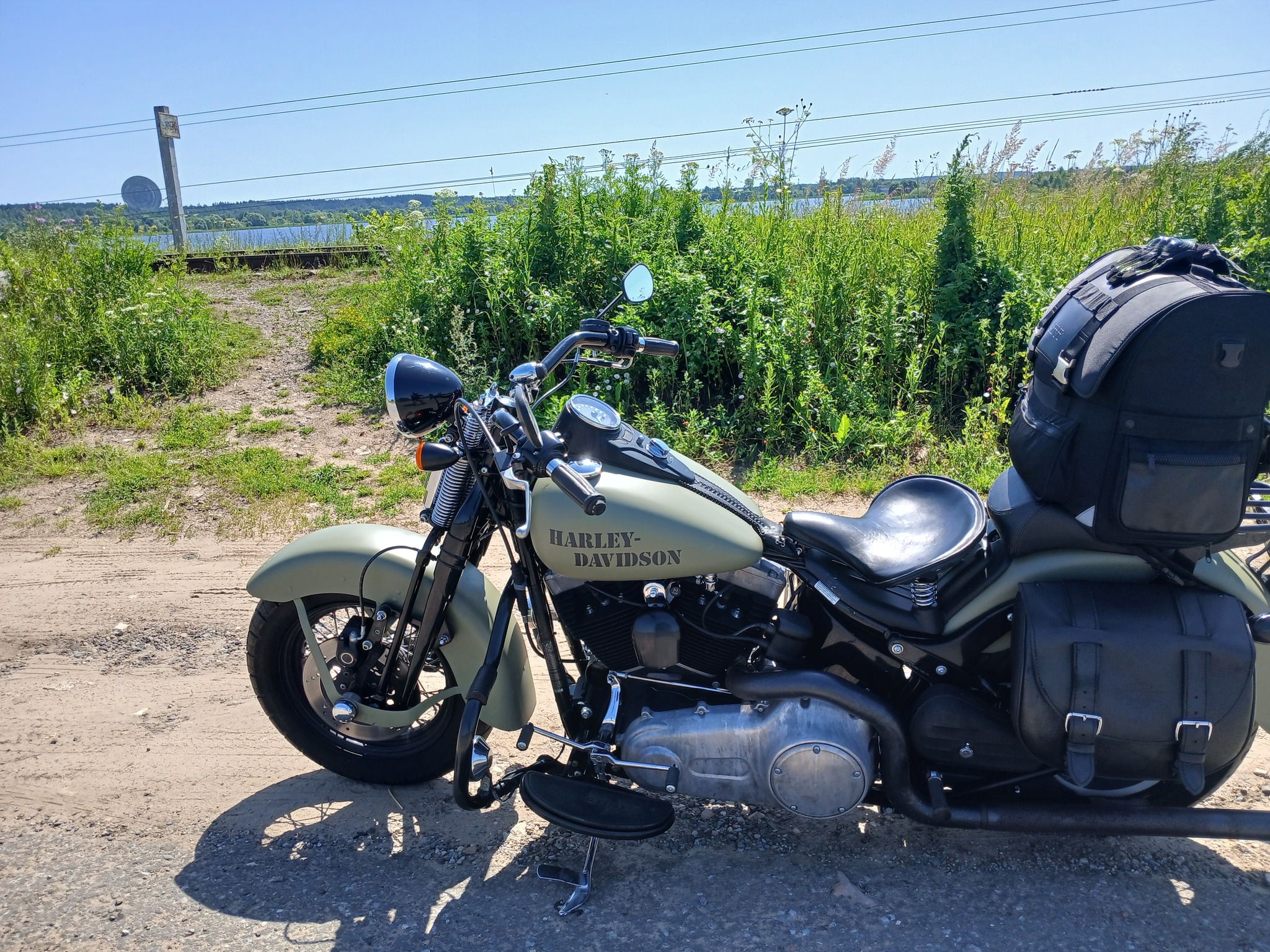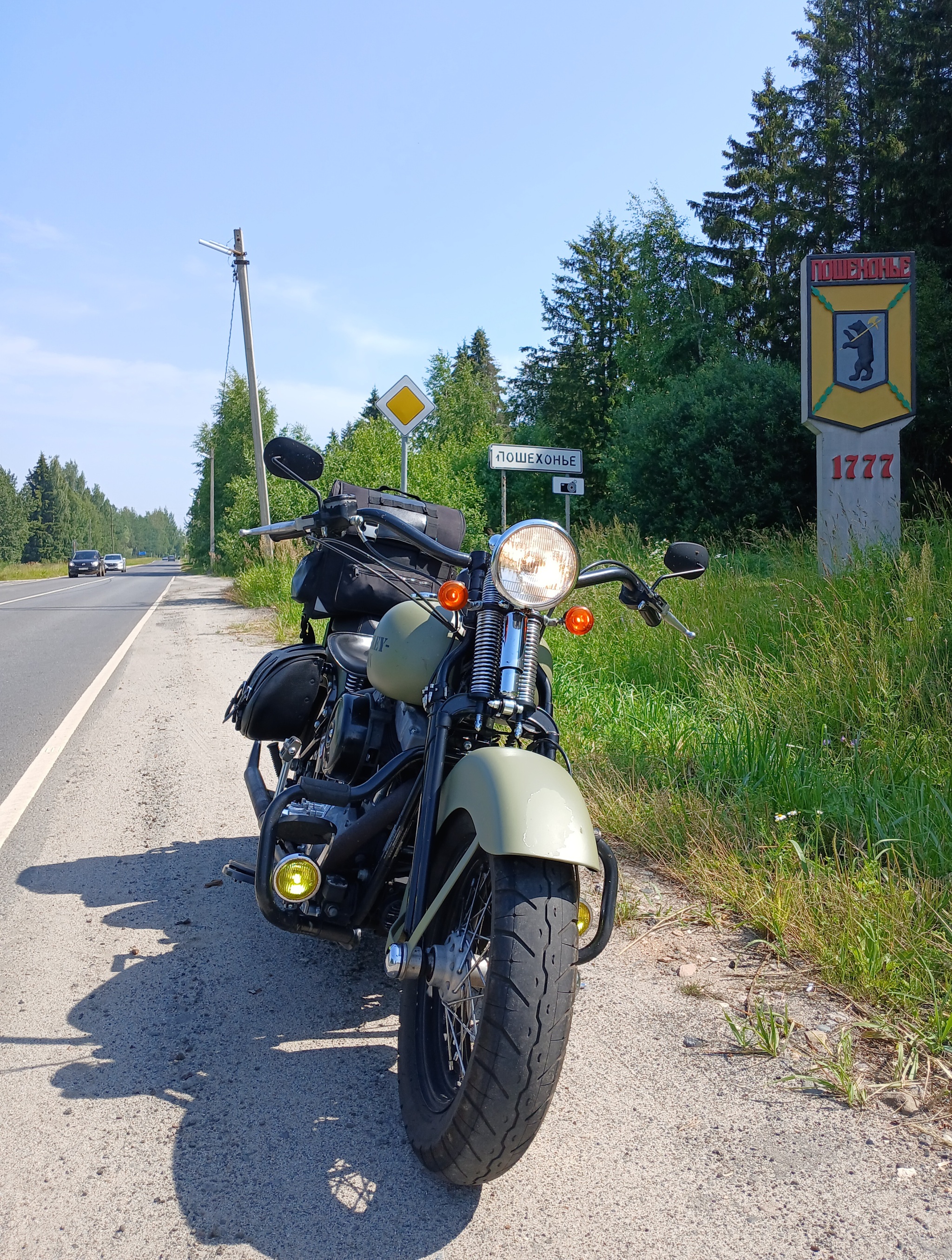 Дальнейшая дорога от Пошехонья в сторону Вологодской трассы представляют собой танковый полигон. Эх, надо было ехать через Ярославль! Мы еле ползём, регулярно переключаясь со второй на первую, по чудовищно разбитым остаткам асфальта, периодически съезжая на песчаную обочину – там хотя бы помягче. Соня героически едет, стоя на подножках и с юмором комментируя происходящий ужас, а я под грохот харлейской подвески ей завидую: с посадкой вперёд ногами особо не постоишь. Шестьдесят километров до деревни Кукобой проходим за три часа! Дальше, слава богу, встречаем строительную технику и дорожных рабочих – проложили новый асфальт от самой федеральной трассы. Строители говорят, что до конца года всю трассу до Пошехонья должны полностью восстановить.