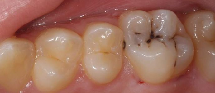 На данном фото видно, что полости как таковой нет, но сквозь эмаль просвечивает чернота - дентин, пропитанный пигментами и бактериями, которые в тепличных условиях благополучно бурят зуб в направлении нерва. Дентин в таком случае становится как масло и снимается пластами, так что приходится довольно сильно иссекать пораженные ткани, что приводит к сильной потере тканей зуба.