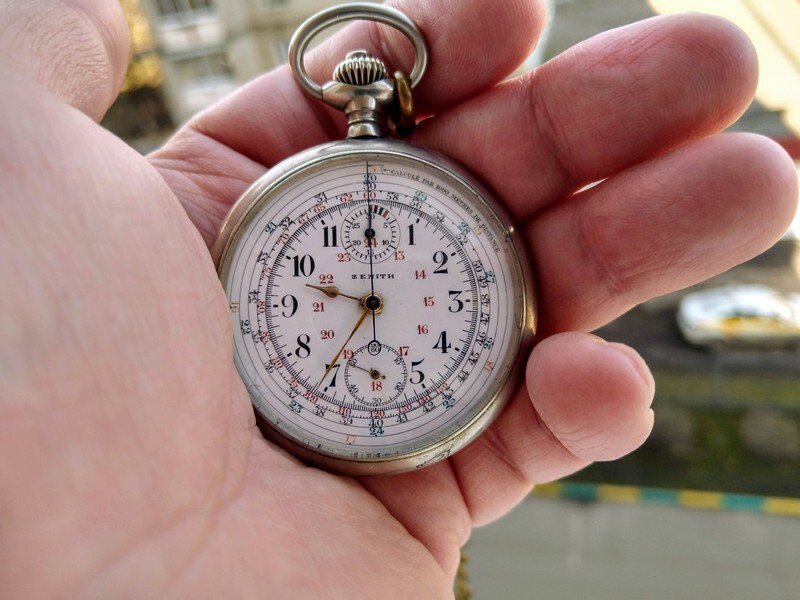 Карманные часы-хронограф Zenith со спиральной шкалой тахиметра. Изготовленные в 1919 г.,